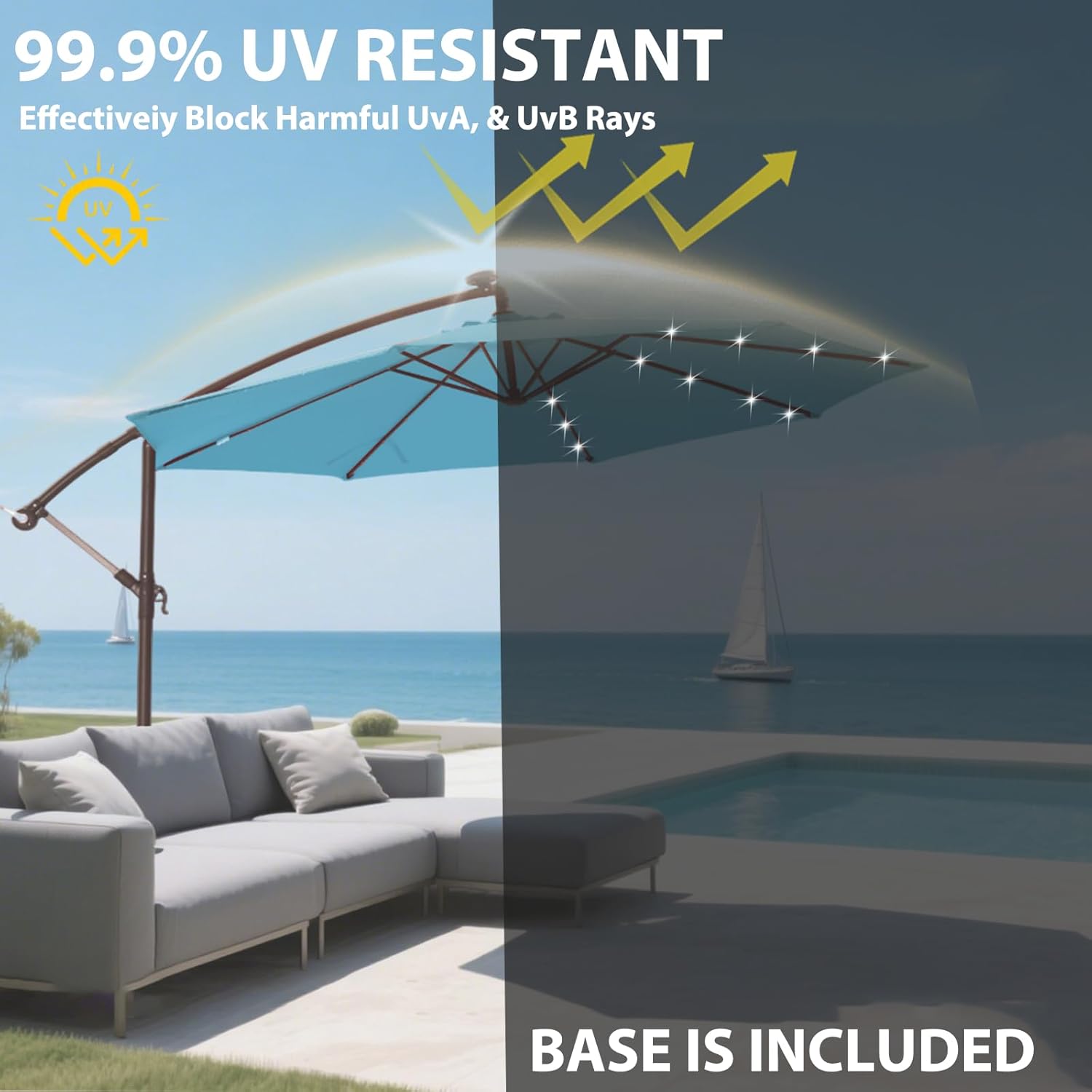 Ayge 10ft Offset Solar LED Outdoor Patio Umbrella, Market Umbrella, Cantilever Hanging Umbrella Outdoor,UV Resistant with Easy Tilt, Heavy-Duty Pool Umbrella for Lawn, Backyard, Light Blue (With Base)