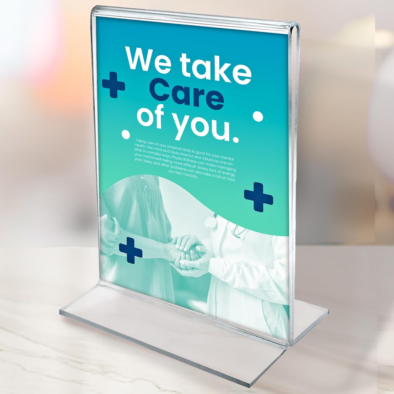 Product Description Azar Display's Clear Plastic T-Shape Table Top Sign Holders are one of the best values in the display market today. This bottom and side loading acrylic frame can be used for pictures, graphics, documents, branding or documents and as a single or double-sided display piece. These Two-Sided Frames are a competitive value with ten in a pack. Great promotional item to give out photos or award certificates. Insert your graphic or literature through the bottom of the frame, easy to swap media in and out. Each double-footed sign holder is made of highly durable acrylic so you don't have to worry about breakage or damage! The clear plastic design has a sleek and modern appearance that matches any décor. Ideal uses are for tradeshows, retail shops, school, hotels, exhibitions, offices, restaurants, and hospitals. This 8.5" w x 11" h sign holder fits standard printer paper and letters. From the Manufacturer This Double-Foot Frame is 8-1/2-Inch W by 11-Inch H and is made of quality acrylic. The frame's bottom load design allows for easy insertion of printed material. This item comes in packs of 10.