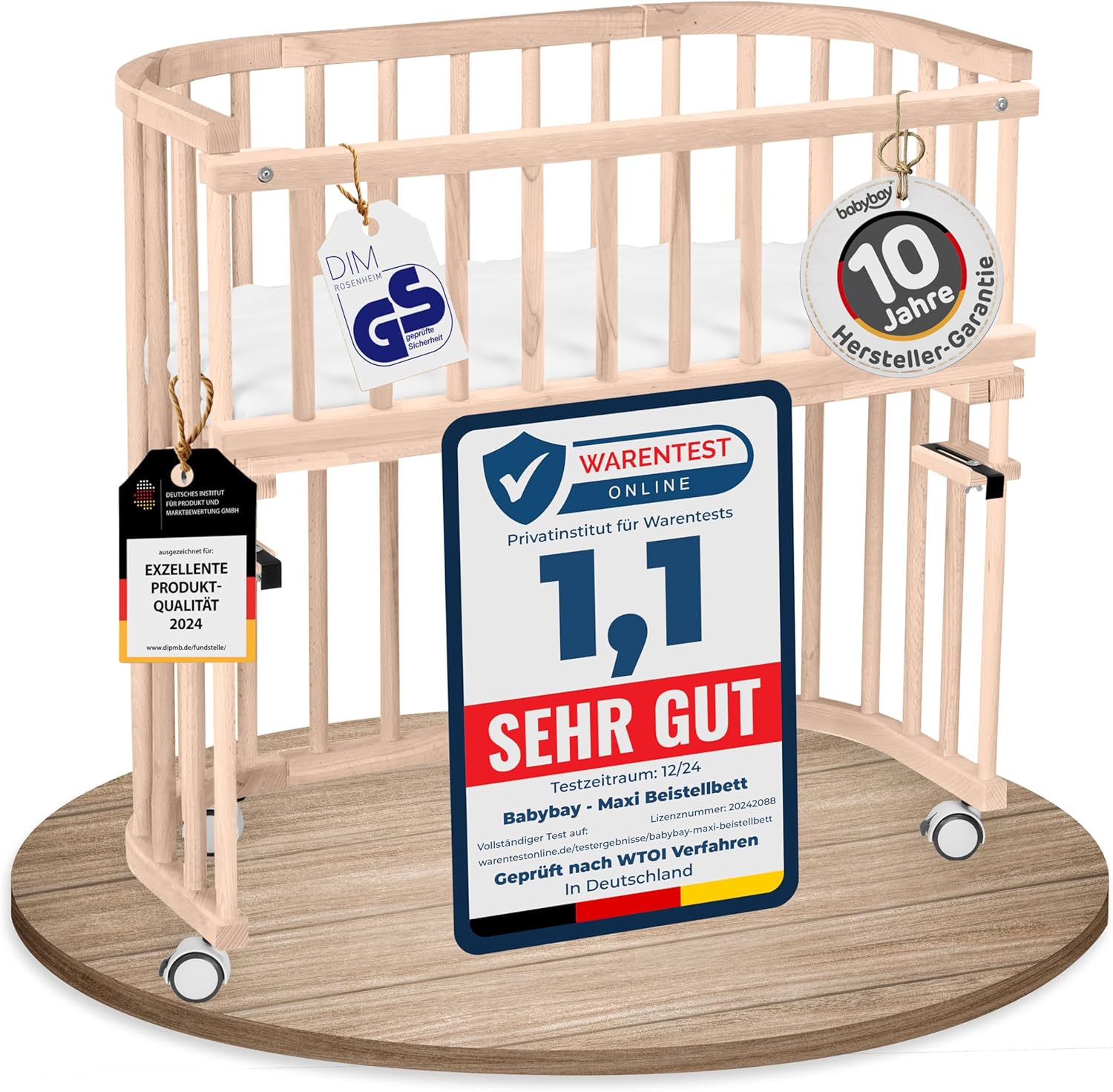 Babybay box spring XXL, the solution for all high beds. Especially in the first months, the close contact between you and your baby is very important, with the extra large XXL lying surface, you can enjoy the proximity to your little one even longer. Babybay box spring XXL is therefore also ideal for twins. Due to the high design and the patent continuous height adjustment, the lying surface can be precisely adapted to high and frameless box spring beds - without step, without gap. Always flush on one level with Mama's bed - the A and O of a side bed - so you always have your pet very close to you. Thanks to the ventilation of the lying surface, which exactly matches our mattresses, very good air circulation is always provided. With the specially designed strap attachment, it can be easily attached to any box spring bed and quickly released again without tools. With the optional mounting set including angles, the babybay box spring can also be attached to high beds with frames. You can choose between different colours, mattresses, cot bumpers and many other accessories and create your own individual dream bed. Babybay grows with you: from the side bed you can make a bench or play table in no time at all, and with optional accessories a bassinet, a playpen or even a small cot. Babybay Boxspring XXL has been awarded several times by leading children's and trade magazines. Midwives and breastfeeding consultants also recommend babybay as an ideal nursing bed. KidsGo pronounces the seal expertise of midwives GUT (1.7) for babybay box spring XXL. Numerous stars and celebrities already use babybay as an extra bed personally and are thrilled. Babybay is available in various finishes. All paints are free from harmful substances and solvents and saliva-resistant and are tested according to DIN EN 71 part 3. Thanks to the solid construction, the bed can hold up to 150 kg and thus can withstand the load of an adult. Babybay is of course subject to permanent tests so that you can be sure that nothing will happen to your little one. It is made entirely of natural, antibacterial and anti-static solid beech wood - without compromises, no wood substitutes. The beech wood comes from sustainably managed local forests.