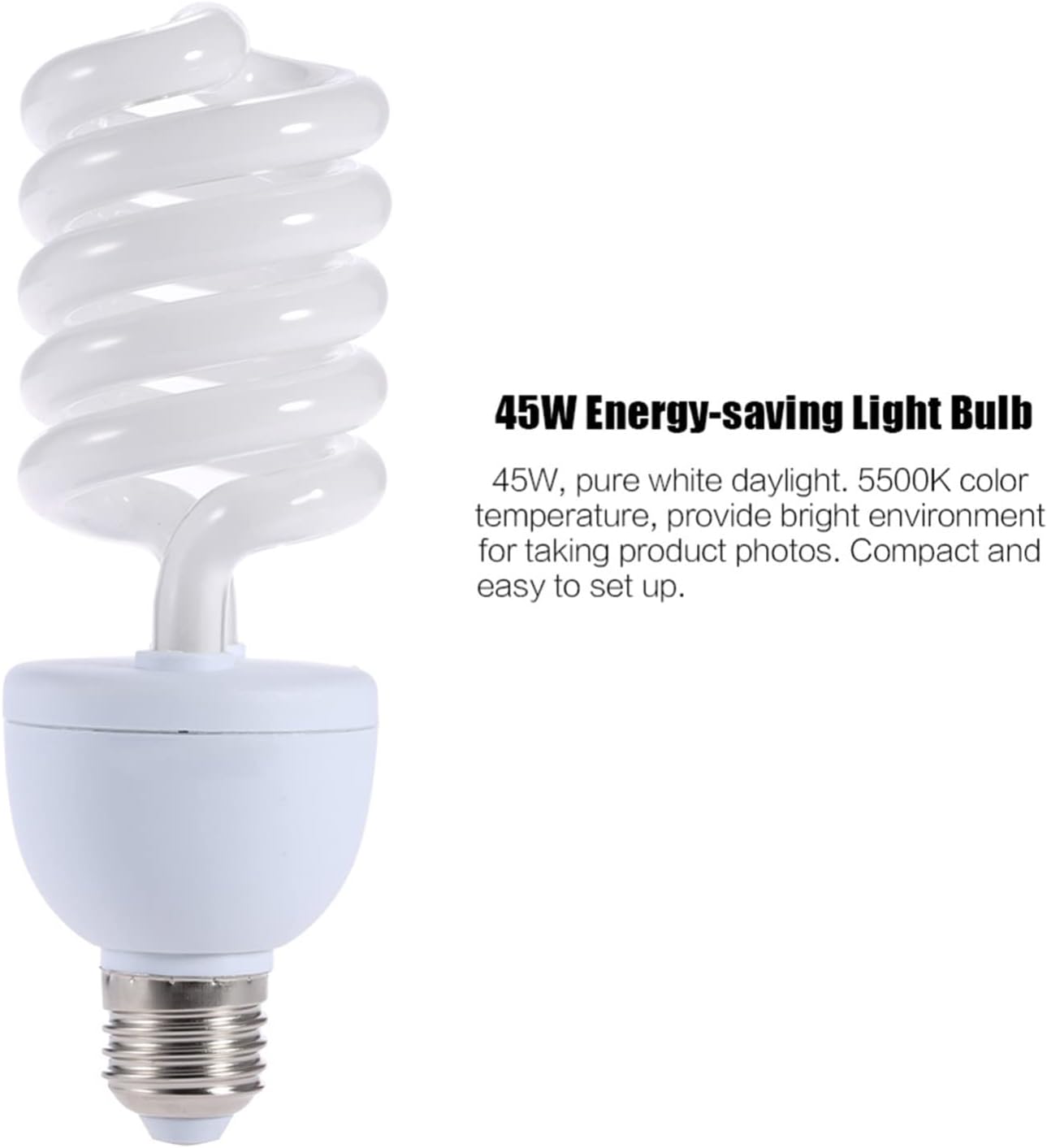 feature:-Premium white soft light umbrella*2Made of high-quality nylon and metal structure.Can diffuse light from any flash or constant light well.It can produce a neutral color temperature.Light weight, easy to set up, reflect and spread light flow uniformly.When opened, the width is 33 inches (85 cm); shaft diameter: 0.31 inches (0.8 cm).-45W energy saving bulb*245W, pure white sunlight.The 5500K color temperature provides a bright environment for product photography.Compact and easy to set up. Its socket fits most standard photographic equipment.Voltage: 230VItem size: approx. 18 * 5.8cm / 7.1 * 2.3in (length * depth)-Rotating socket * 2Designed for all spiral lights.The built-in umbrella stand is very suitable for holding a soft umbrella.It can be installed on any standard light stand.Easy to adjust to suit different shooting angles.The long rope helps you move them freely to position them for the best lighting effect.Plug: EU plug, 230V-2m/6.6ft light stand * 2Three-stage design, the working height is adjustable from 75cm to 200cm.Folding height: 665mm; pipe diameter: 25mm / 22mm / 19mm.It can provide excellent intensity for heavy work and ensure the safety of your lighting equipment when in use.The light stand supports all major photography equipment, such as studio lights, lamp holders, light bulbs, umbrellas, etc. packing list:2*White Umbrella2*45W bulb2 * Rotating socket2 * 2m/6.6ft light stand