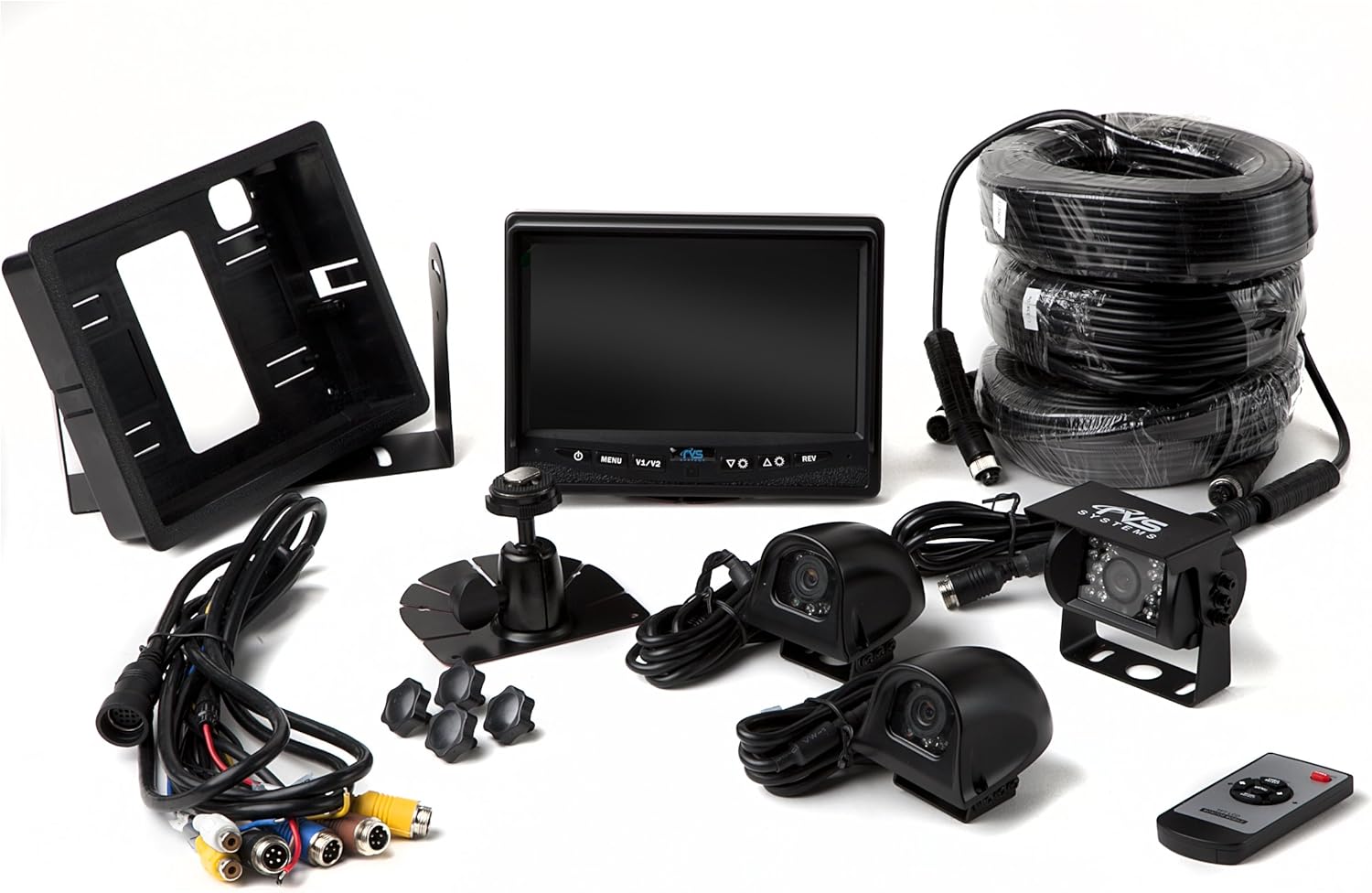 This system is complete with a color 7" TFT LCD quad view monitor with mirror image capability, a 4 port power harness, a 130° CCD backup camera with 50 foot infra-red night vision, 2 (Two) 120° CCD Side Cameras and all the wires, connectors and mounts you will need. The system is completely weatherproof, strong and reliable, shock resistant with a 10G impact rating (highest in the industry) and comes with a full year warranty.