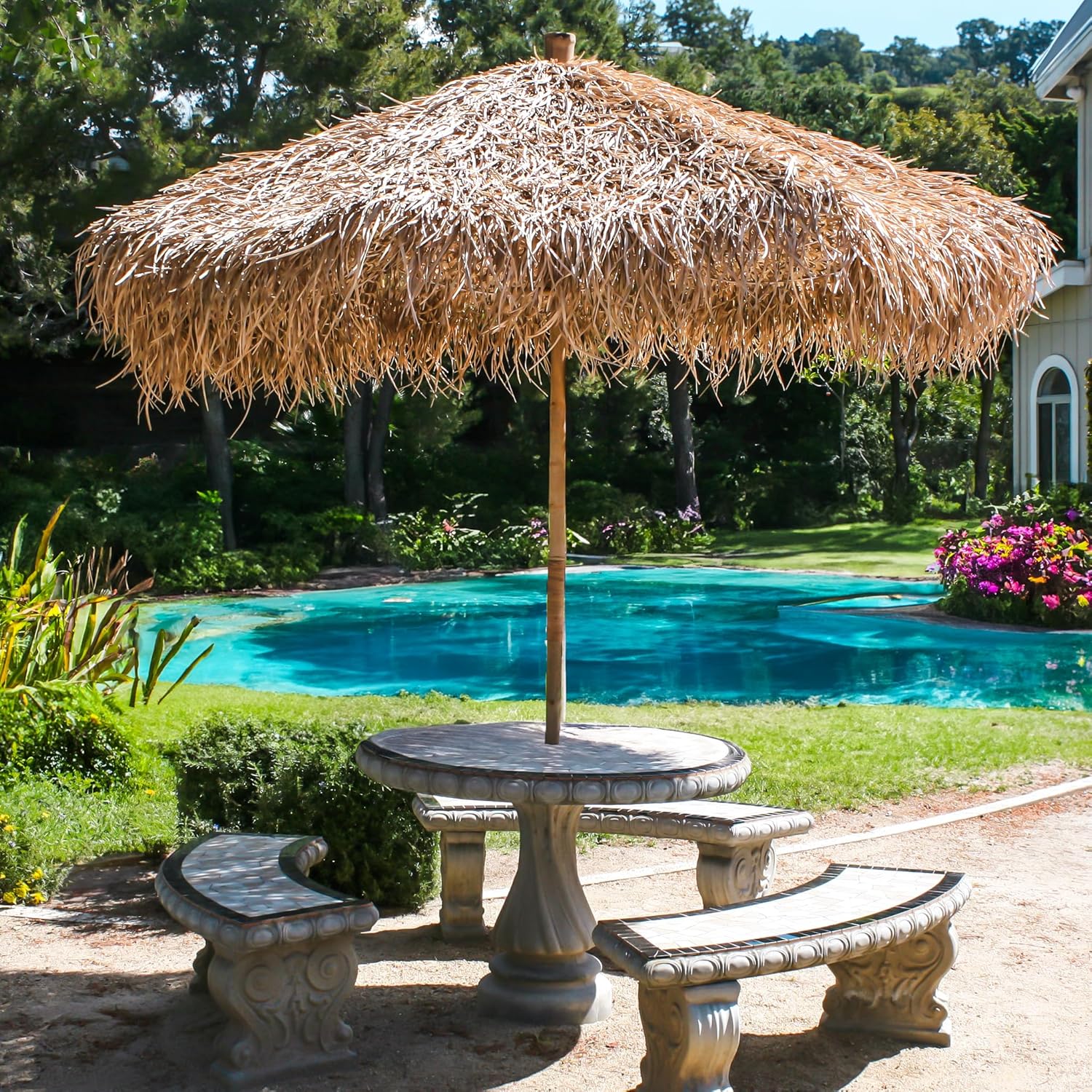 Bamboo Sea Grass thatch patio umbrella helps create a tropical oasis right in your backyard. Heavy-duty, made of natural material, Backyard X-Scapes Bamboo Sea Grass Tiki Thatch umbrella is designed to withstand the various weather, from sunny and hot to windy and rainy. Portable, 7 ft. tall pop-up umbrella features Market Style construction and adjustable 3-point height, steady thick-walled bamboo umbrella pole with structural metal plating reinforcement for durability. Patio umbrella measures 8.25 ft. tall x 9 ft. Dia, pop-up umbrella shade from sunrise to sunset. Tiki Umbrella is made of high-quality Bamboo ribs and a thick-walled bamboo umbrella pole with structural metal plating reinforcement, natural Sea Grass thatch canopy, and Polypropylene Rope to secure the canopy in place. Natural Seagrass thatch acts like a natural insulation to your space keeping it warm when it's cold outside, the hand-woven leaves allow the breeze to flow through, keeping the shade cool during the hot summer months. Eco-friendly, sustainable materials promote environmental responsibility.
