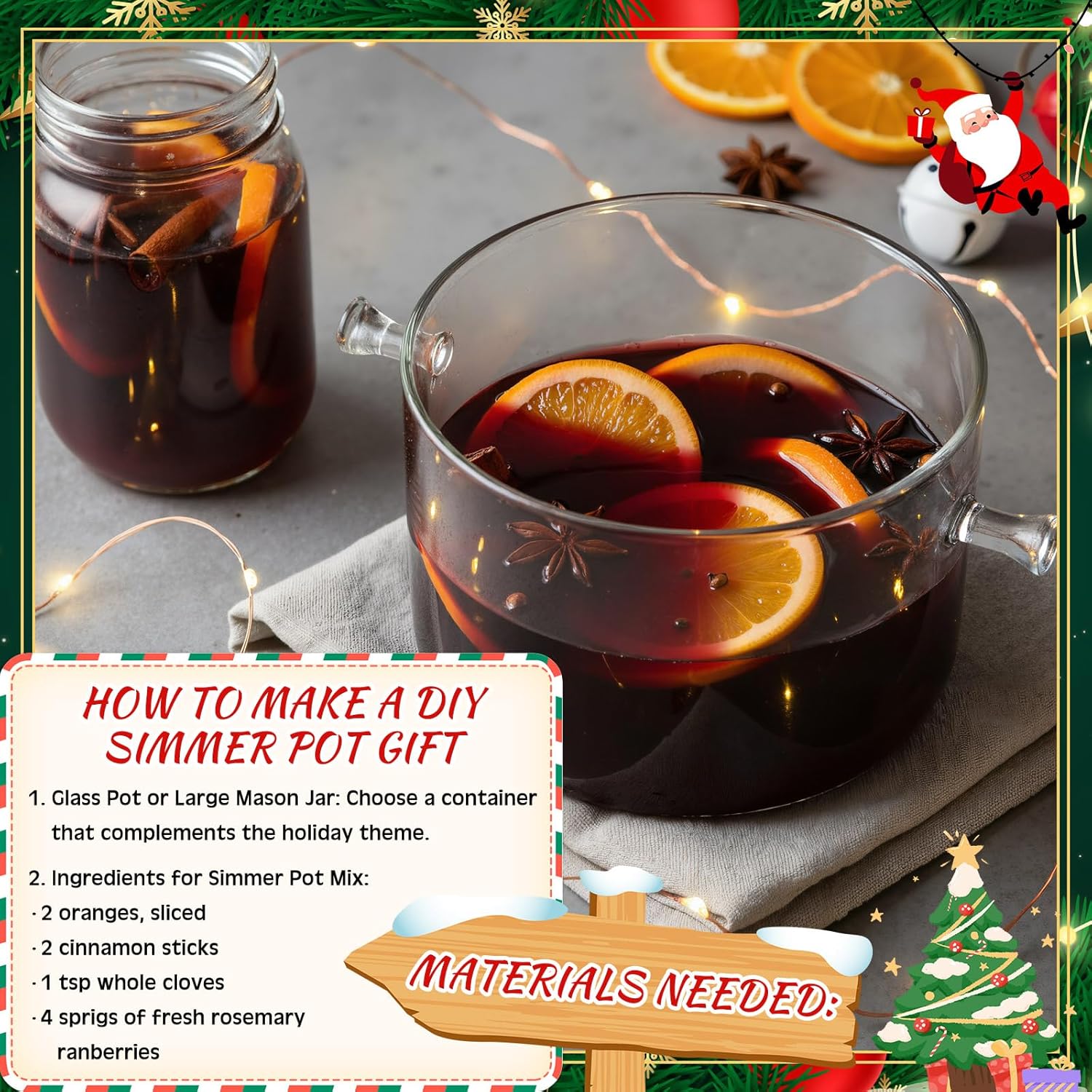 Features: Create unforgettable holiday moments with this Christmas simmer pot gift set! The complete kit features a glass simmer pot for stove top (50oz), 2 mason jars for storage, a festive red spoon, and charming decorative accents. Perfect for making traditional holiday scents or gifting to loved ones, this Christmas simmer pot kit brings warmth and cheer to any home. Simply add seasonal ingredients to the cooking glass festive pot, simmer gently, and enjoy the magical aromas of Christmas. Beautifully packaged with twine, ribbon, and greeting cards, it's the ultimate thoughtful Christmas gift for creating cherished traditions. The simmer pot for stove top safely diffuses festive scents throughout your home, while the included berries, pine sprigs, and cards add decorative charm. A perfect Christmas simmer pot gift set for bakers, hosts, or anyone who loves holiday homemaking. Give the gift of seasonal joy and delicious aromas this Christmas! Specifications: Material: Christmas simmer pot: glass Stirring spoon: silicone Christmas card: paper Color: Christmas simmer pot: clear Stirring spoon: red Christmas ribbon: red Size: Christmas simmer pot: about 50 oz/ 1500 ml Mason jars: about17 oz/500ml Stirring spoon: about 8.3 inches/ 21 cm Christmas card: about 5.9 x 3.9 inches/ 15 x 10 cm Christmas cotton rope: about 787.4 inches/ 20 m Christmas handmade jute rope: about 787.4 inches/ 20 m Red ribbon: length of about 360 inches/ 10 yd Package includes: 1 x Christmas simmer pot, 2 x Mason jars 1 x Stirring Spoon, 2 x Christmas card 1 x Cotton rope, 1 x handmade jute rope, 1 x Red ribbon 2 x Artificial red berries, 2 x artificial pine needles Notes: Manual measurement, please allow slight errors on size. The color may exist a slight difference due to different screen displays