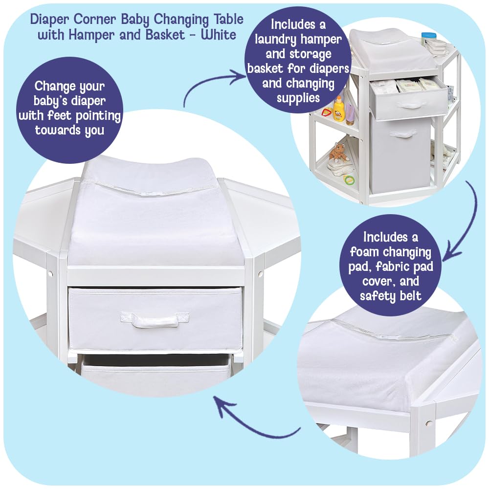 Product Description Capitalize on the corner space in Baby's nursery! Badger Basket's Diaper Corner allows you to change your infant with feet pointing towards you. Includes a hamper and storage basket/drawer! Hamper can be removed for carrying laundry to the laundry room, or to use the hamper anywhere else in the house. If you aren't using the hamper, your diaper pail will fit conveniently into that spot, too! Hamper measures 13.5 inches W x 13.5 inches D x 21.5 inches H. Pull-out basket is a convenient drawer for storing diapering supplies, baby blankets, etc. Basket measures 16 inches W x 17.75 inches D x 6 inches H. The table also features shelf storage space on either side of the changing area and on both sides below! Measures about 33.5 inches high to the top of the contoured, 16 inches x 31 inches x 3 inch changing pad. Measures 31 inches from the back corner to the front edge; 40.25 inches across the widest measurement from corner to corner. The left and right sides that sit against the wall measure 28 inches from back corner to front. The angled side panels in front measure 16.5 inches wide; and the straight edge across the front measures 16 inches. Also includes a safety belt and one white, terry cloth changing pad cover. Wipe the table clean with a damp cloth and mild soap. Table is made with wood, multi-layer wood and wood composites, and veneers. All paints and finishes are non-toxic. Fabric pad cover is 80% polyester/20% cotton. Assembly required; illustrated instructions included. Toys and accessories shown with the table are not included except as mentioned above. Changing table can be used with children weighing up to 30 lbs. (13.6 kg). This item ships in its original carton which may include a photo of the product. More detail on the hamper and basket: Helpful handles on the hamper for lifting and carrying. Hamper fabric a 65% polyester/35% cotton blend and can be spot cleaned. Basket fabric a 80% polyester/20% cotton blend and can be spot cleaned. From the Manufacturer Badger Basket’s Diaper Corner Baby Changing Table with Hamper and Basket is an innovative and unique angle on changing tables! Capitalize on the normally unused corner space in Baby's nursery. The Diaper Corner allows you to change your infant with feet pointing towards you. Includes a laundry hamper and one storage basket/drawer! Also features handy storage shelves on either side of the changing area and four side shelves below. You won't believe it takes up such a small area in the corner! Hamper has handle slots, is independent of the table, and can be removed for carrying laundry to the laundry room or to use the hamper anywhere else in the house. If you aren't using the hamper, your diaper pail will fit conveniently into that spot, too! Pull-out basket is a useful drawer for storing diapers, wipes, lotions, baby blankets, and more. Handle on the front of the basket makes it easy to open one handed and get what you need while changing your baby. Basket slides open smoothly and is fully removable so you can effortlessly access all the space inside. Take the basket anywhere in the house to fill or empty it. With the basket and hamper removed completely, you have a tall, open storage area. The Diaper Corner is a convenient way to add an unobtrusive changing station to any other floor or room in the house. Includes a foam changing pad, with white, terrycloth pad cover, and a safety belt, too. Can be used as a storage/book/game shelf or TV/media center when your child outgrows the changing table. Remove the bottom panel in the hamper or basket and they fold flat for storage. Sturdy table is made with wood, multi-layer wood, wood composites, and veneers. Fabric pad cover is 100% Cotton. Outside of hamper and basket is 80% Polyester/20% Cotton. Non-Woven fabric inside hamper and basket and on their bottom panels. Changing pad is polyurethane foam covered with wipe clean PEVA (non-PVC) vinyl. All paints and finishes are non-toxic. The Diaper Corner measures 35 inches H to the top of the contoured changing pad (32.75 inches H from floor to top shelf), 30 inches from the back corner to the front edge, and 40.25 inches W from corner to corner. Hamper measures 13.5 inches L x 13.5 inches W x 19.75 inches H. Basket measures 15.5 inches L x 17.5 inches W x 6 inches H. Hamper shelf: 16 inches L x 23 inches W x 21 inches H. Basket area: 16 inches L x 23 inches W x 6.25 inches H. Triangle shelves: 20.5 x 14.5 x 14.5 inches. Changing pad: 16 inches L x 31 inches W x 3 inches H. Assembled weight: 35.5 lbs. All measurements approximate. Wipe the table and changing pad clean with a damp cloth and mild soap as needed and dry thoroughly. Spot clean hamper and basket as needed. Never immerse the hamper and basket in water due to the internal cardboard support panels. Fabric pad cover can be machine washed in cold water, gentle cycle, and air dry or tumble dry low. Hamper and Basket color depends on color of the table (will be either White or Ecru). Changing table is for use with children weighing up to 30 lbs (13.6 kg). Adult assembly required. Illustrated assembly instructions included. Meets all currently applicable testing standards. Product includes a limited warranty of 30 Days Parts to the original purchaser. Product may vary slightly from shown and described. Props/accessories shown are for illustration purposes only and are not included with the product. Actual color/finish may vary slightly from screen display. This item ships in its original carton which may include a product photo.