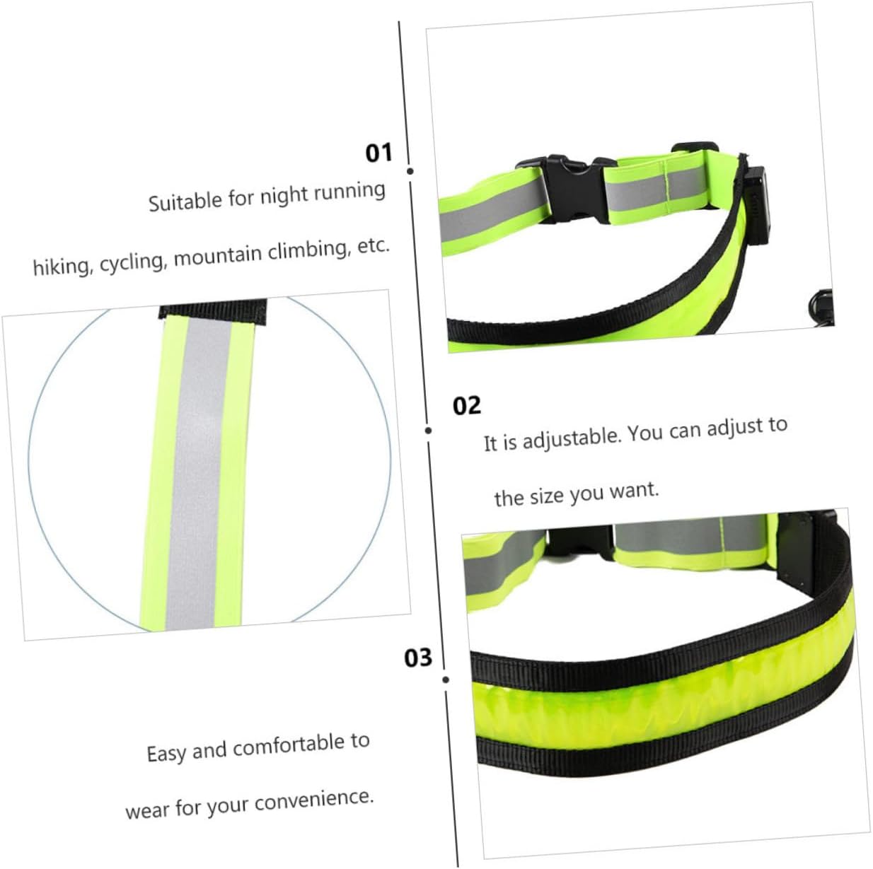 Package Include 3 x Belt 3 x USB Cable Characteristics - Size: About 90.00X5.00X0.10cm/35.37X1.97X0.04in Rechargeable Running Waist Belt. - Color: Green night running gear. - Material: PVC, ABS, LED running gear. - Play the warning role in dark when running outside waist belt. - USB rechargeable, giving you high visibility wrist straps. - Comfortable buckle design, firm and not easy to slide down reflective belt. - Adopted of premium material, it is durable and comfortable when using it high visibility belts. - Great gift for those outdoor activities enthusiasts Safety Light Belt. Goods Description Polyester Belt Adopted of premium material, it is great for night running, hiking, cycling, mountain climbing, etc.wrist It is effective to play a warning role in dark.rechargeable running belt Fashionable, highly reflective, adjustable, rechargeable, all of these advantages you want for the LED running belt are all here