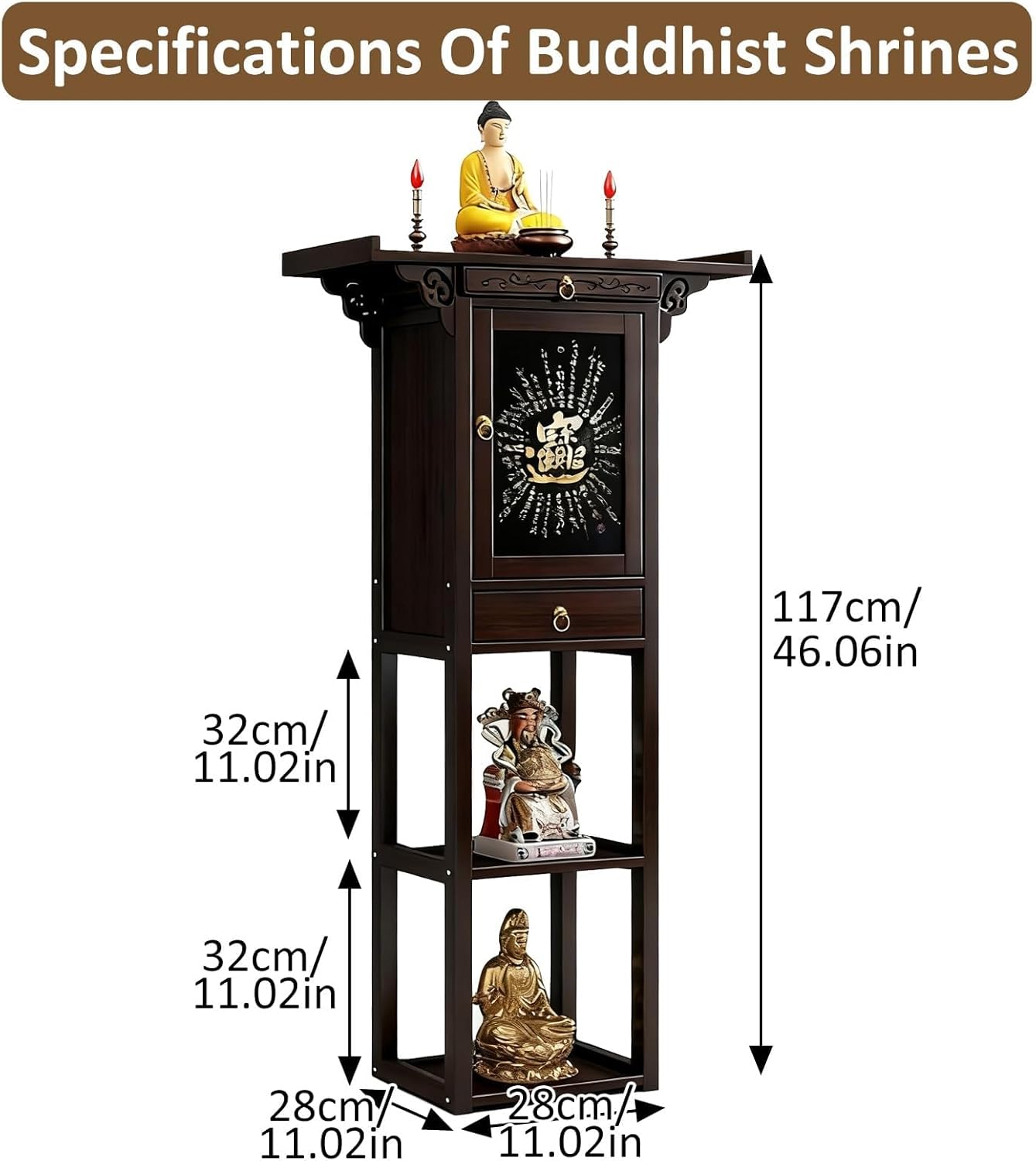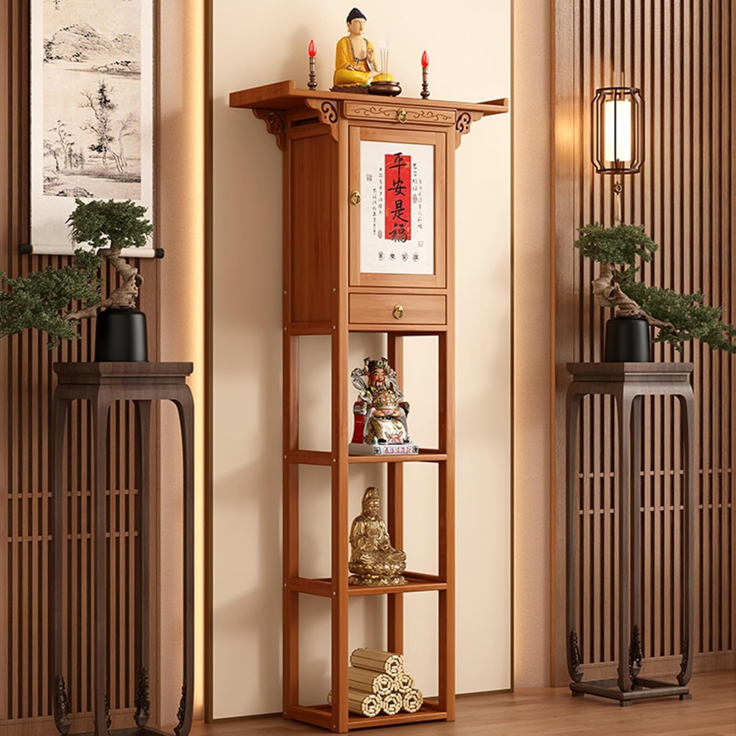 This freestanding bamboo altar table is designed to create a serene and sacred space in your home. Combining traditional craftsmanship with modern functionality, it features a sturdy bamboo frame and MDF panels for durability, ensuring it withstands daily use while maintaining its elegant appearance.The multi-tiered open shelves offer ample space to display religious statues, incense holders, and decorative pieces, with a wide depth of 28cm to accommodate larger items. A large drawer and pull-out altar surface provide convenient storage for prayer beads, scriptures, and other essentials, keeping your ritual items organized and within reach.Intricate carvings and a glass-fronted cabinet add a touch of traditional charm, while the table edge tilt ensures stability during use. Its compact floor-standing design (28cm x 28cm x 117cm) makes it perfect for small spaces, such as living rooms, entryways, or meditation corners, allowing you to create a dedicated prayer area without sacrificing floor space.Whether you’re practicing Buddhism, Taoism, or simply seeking a peaceful space for reflection, this altar table provides a beautiful and functional centerpiece for your home.