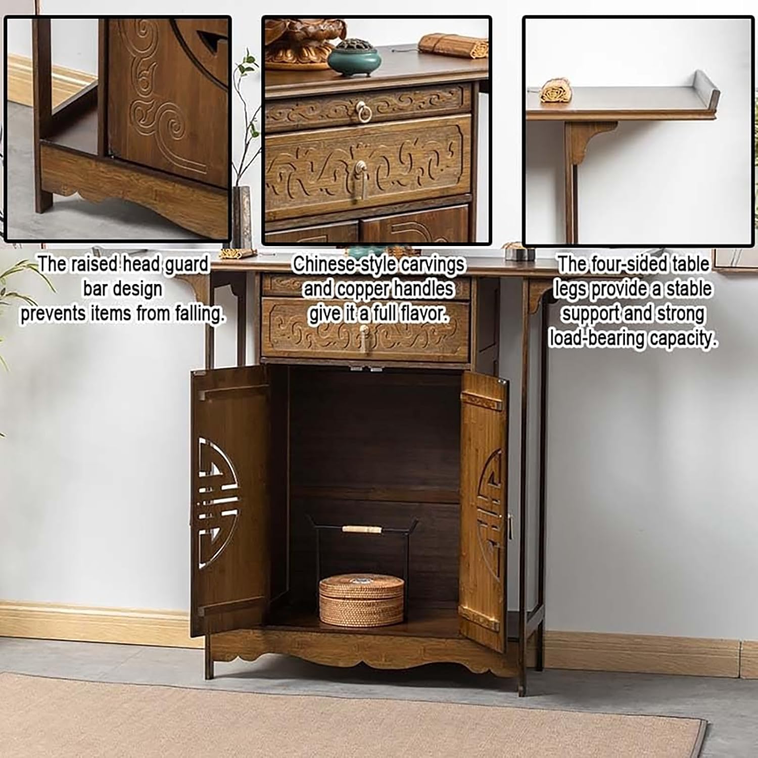 This meditation prayer table can be used as the core of a personal spiritual space, and can also be perfectly integrated into the home, meditation room or altar area. Whether it is to worship statues, light candles, place holy objects, or perform rituals and meditation practices, it can provide you with a sacred and harmonious space.This personal shrine altar table adopts a sturdy and stable structural design, and selects thickened panels to ensure strong load-bearing capacity and is not easy to deform or tilt. The precise splicing process makes the components tightly combined to ensure the overall stability and durability.This meditation altar table cabinet adopts a convenient and fast assembly design, and all components are precisely processed to ensure tight and stable splicing. Equipped with necessary accessories, it can be easily assembled without complex tools.Product SpecificationsName:Buddhist Altar, Altar Cabinet, Prayer Altar, Personal Shrine Altar Table, Altar Table with Storage, Chinese Cabinet Pedestal Offering TableMaterial: BambooSize:80x40x108cm/31.5x15.7x42.5in100x40x108cm/39.4x15.7x42.5in120x40x108cm/47.2x15.7x42.5in140x40x108cm/55.1x15.7x42.5inWarm TipsPlease confirm the size before purchase. Due to manual measurement, there may be an error of 1-3cm. Please understand.The product display picture is for reference only. Except for the table, other accessories are not included.Due to different display devices, there may be slight deviations in product color. Please refer to the actual product.