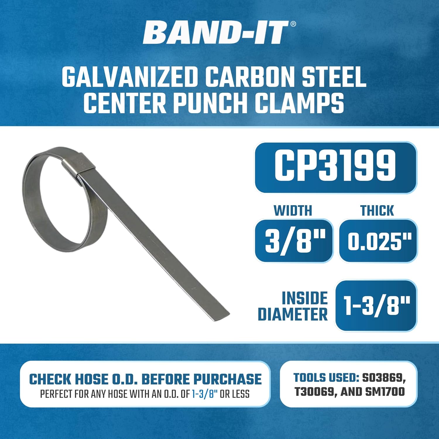 Galvanized carbon steel band offers medium strength with medium corrosion resistance to mild chemicals and occasional fresh water. Center Punch clamps use a punch style clamp for economy and ease of installation. For general plant maintenance or emergency field repairs. BAND-IT Center Punch Clamps are constructed with a double wrap of band material which increases the holding power of clamped assemblies. Center Punch Clamps can be installed with BAND-IT hand tools: S03869, or T30069, or pneumatic production tool: SM1700.