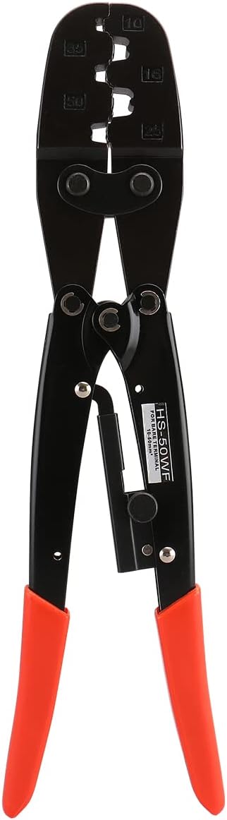 SPECIFICATION Model: HS-50WF AWG 8-1/0 Crimping Capacity: 10,16,25,35,50mm²Application: Insulated and Non-Insulated Terminals Length:320 mm/ 12.6 InchWeight: 800g / 1.76 lbsMaterial: Metal FEATURES The Ratchet Terminal Crimper is designed by labor-saving design. The components of the ratchet crimping tools are made of special steelErgonomic bi-material handles,Integral lock with self releasing, good for comfortable and secure gripCrimping pliers tool with self-adjustable ratchet mechanism, To reduce the loss of operation error,ensure high-quality repeat crimpThe precise crimping die creates a secure crimp that resists pull-out to keep the wire connector more firmly