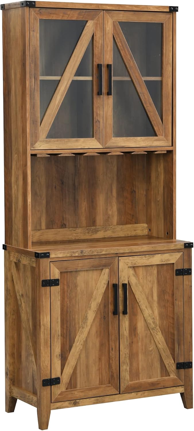 Add a stylish, versatile unit to your home with the addition of a Bar Cabinet. The bottom of the unit has double door cabinetry with knobs on each door, allowing easy access for entry. The top cabinet has two glass doors with two wood shelves to house your favorite wine glasses along with other household essentials that need a home. The bottom cabinet has two bran look wood doors with 2 shelves for any other items you need to store. The open shelf is great to showcase any additional beverage bottle, your favorite decor, coffee station and even a microwave. There are endless possibilities with this unit to maximize your current space, regardless of its size. The bar cabinet gives ample storage while simultaneously keeping everything contained and out of sight.