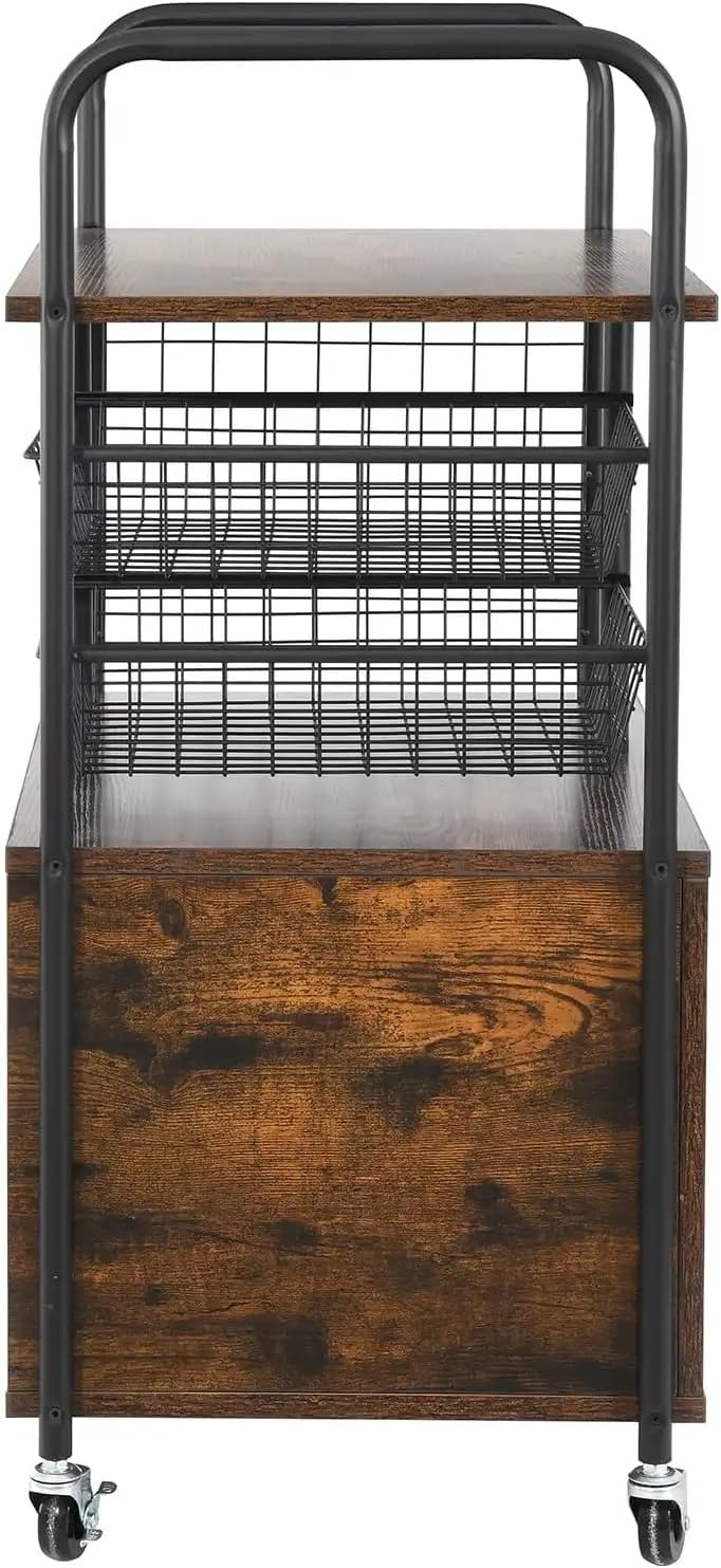 KITCHEN CART WITH STORAGE: Crafted from black metal frame & PB board provides high carrying capacity for kitchen storage; the rustic industrial lends a touch of & freshness to any culinary space.MAXIMIZED STORAGE SPACE: The bottom enclosed cabinet features a large capacity, allowing you to store kitchen tableware, microwave oven and bracket & keep all essentials neat and clean.FLEXIBLE MOBILITY: 360° industrial wheels are easy to move and can bear heavy loads without breaking, sturdier other plastics; 2 of them are lockable to ensure high stability when stopped; a large handle lets you move the cart or hang towels for easy access.CONSIDERATE DESIGNS: 2 pull-out baskets can hold wines, bowls & dishes for easy access & better ventilation; and side hanging wire with 4 hooks also allows you to hang utensils, spoons, towels to help you work more efficiently.EASY ASSEMBLY: Comes with clear instruction & tools so that you will never get stuck in assembling; we strive to provide customers with great products and service. Any problem will be solved promptly to your satisfaction.3-Tier Kitchen Trolley with Cabinet & Movable Basket.Offering plenty of space for kitchen storage, rolling kitchen carts with cabinet bring function to keep all your essentials organized.Just push this kitchen out to your living room to enjoy casual snacks, fruits and drinks while watching TV & chatting with families, more convenient & clean! It's a space-saving kitchen helper to place microwave ovens, roasters, cookware & hold your food, plates, cups, wine and more for any small tight culinary space.This small kitchen cart with 4 easy roll locking industrial casters for your convenience.An attractive & functional serving trolley cart fits any culinary space.SpecificationsMaterial:Board, Wood, Glass, MetalAssembled Product WeightL:41.45 lbColor:BrownManufacturerFeatures:StorageFinish:Brown, BlackIs Assembly Required:YAssembled Product Dimensions (L x W x H):24.00 x 15.70 x 34.80 Package: 1 1x Kitchen Cart; 1x Manual; 1x Accessory Package; 4x Casters (Does not include other demo goods)1. Due to light and screen differences, the color may be slightly different from the picture.2. Due to manual measurement, please allow 1-3 cm difference.3. Thank you for your understanding.assembly—just follow the instructions.