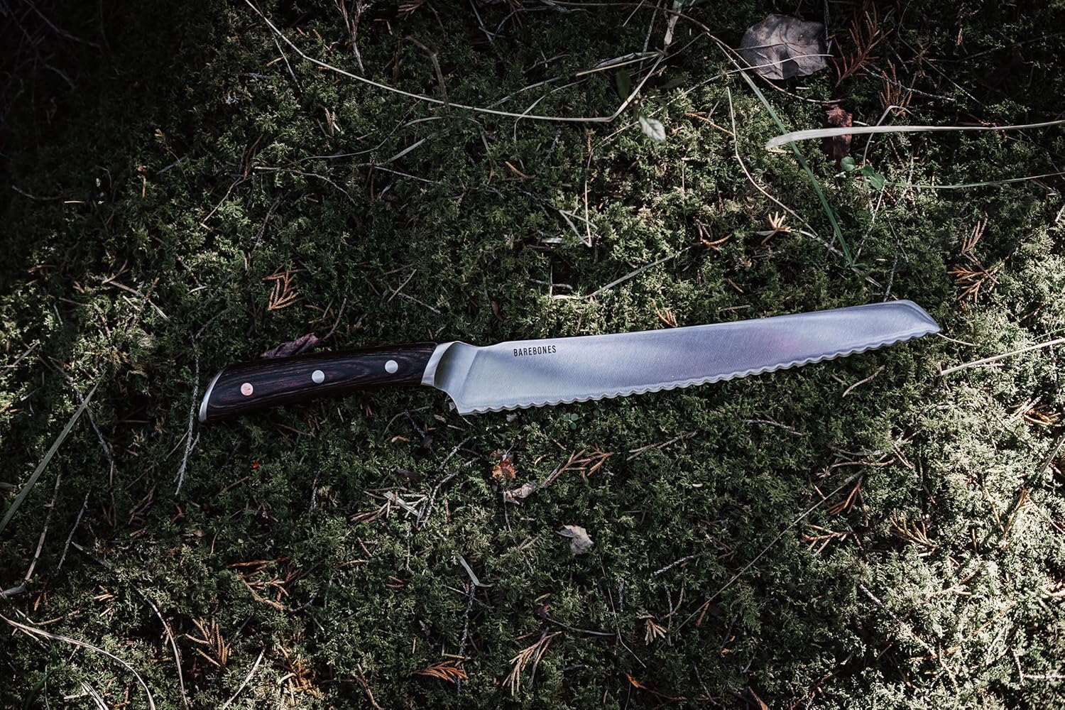 Once you own a bread knife, you never go back. This 14" thin blade has sharp, serrated edges that effortlessly slice through bagels, cakes, and baguettes. Unlike a standard serrated knife, the extended length cuts accurately through thick baked goods: Bake or purchase a fresh loaf of bread and cut the slices to your preferred thickness. This bread knife also functions as an excellent all-around deli knife for thinly sliced meats. The full-tang, forged stainless steel blade is German-grade, strong, and durable. Blade notches for thumb and finger allow for a professional grip, control, and accuracy when slicing, dicing, and mincing. Pakkawood handle is weighted and balanced; This stabilized composite wood is ideal for culinary purposes as its heat and moisture-resistant. Included sleeve weathers real-world use while protecting the blade from dulling. Leather material will only soften over time to a beautiful, smooth patina.