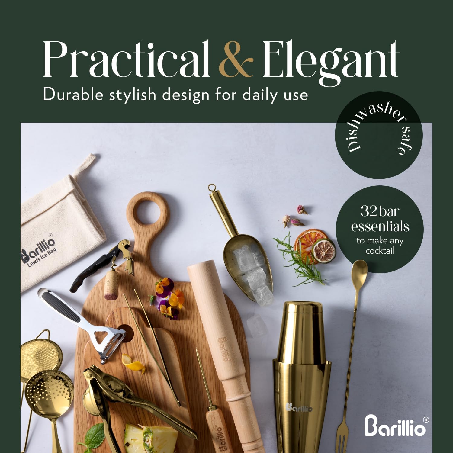 | Included Components | 24 Oz Gold Cocktail Shaker, 18 / 28 Oz Boston Shaker, Diamond Mixing Glass, European Mixing Spoon, Japanese Mixing Spoon, Drink Muddler, 2x Stainless Steel Jiggers, Plastic Jigger With Measurements, Mint Julep Strainer, Hawthorne Strainer, Fine Mesh Strainer, Ice Tongs, Ice Scoop, Ice Muddler-mallet, Lewis Bag, Ice Pick, 4x Liquor Pourers, 3x Stoppers, Corkscrew, Beer Opener, Lemon Zester, Citrus Squeezer, Peeler, Tweezers |