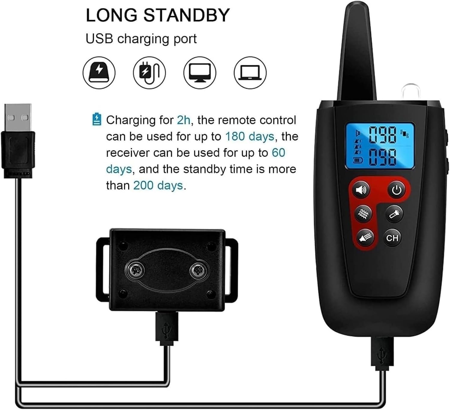 Specification:Name: barking dog collarsMaterial: ABS/PU/siliconePower supply mode: USB chargingMode: Sound mode, vibration mode, static modeRemote control range: 1000mCollar length: 80cmrating: IP67Applicable objects: 4lbs to 120lbs dogsPacking:Remote control x1Receiver x1