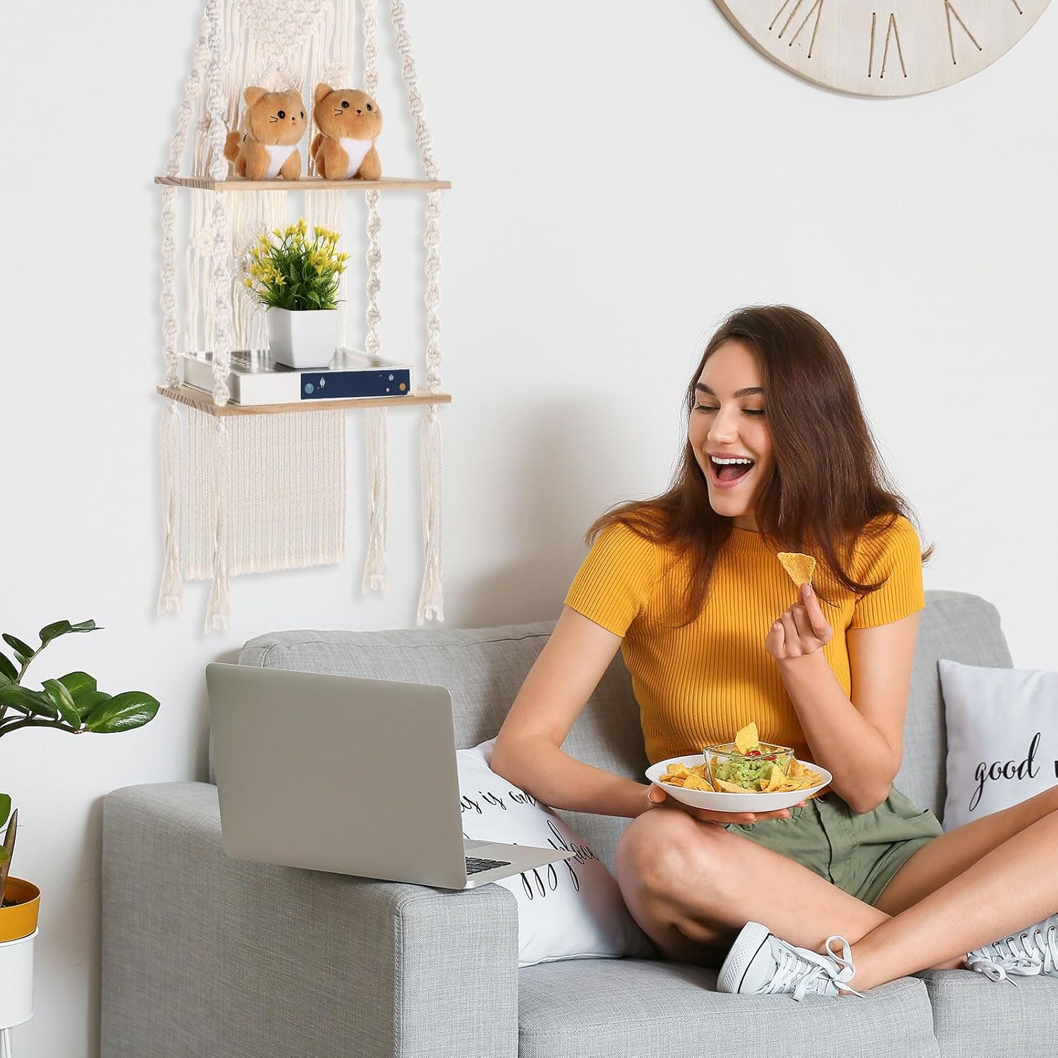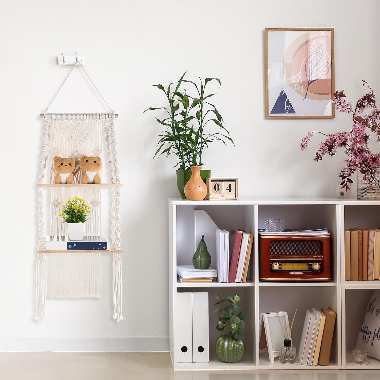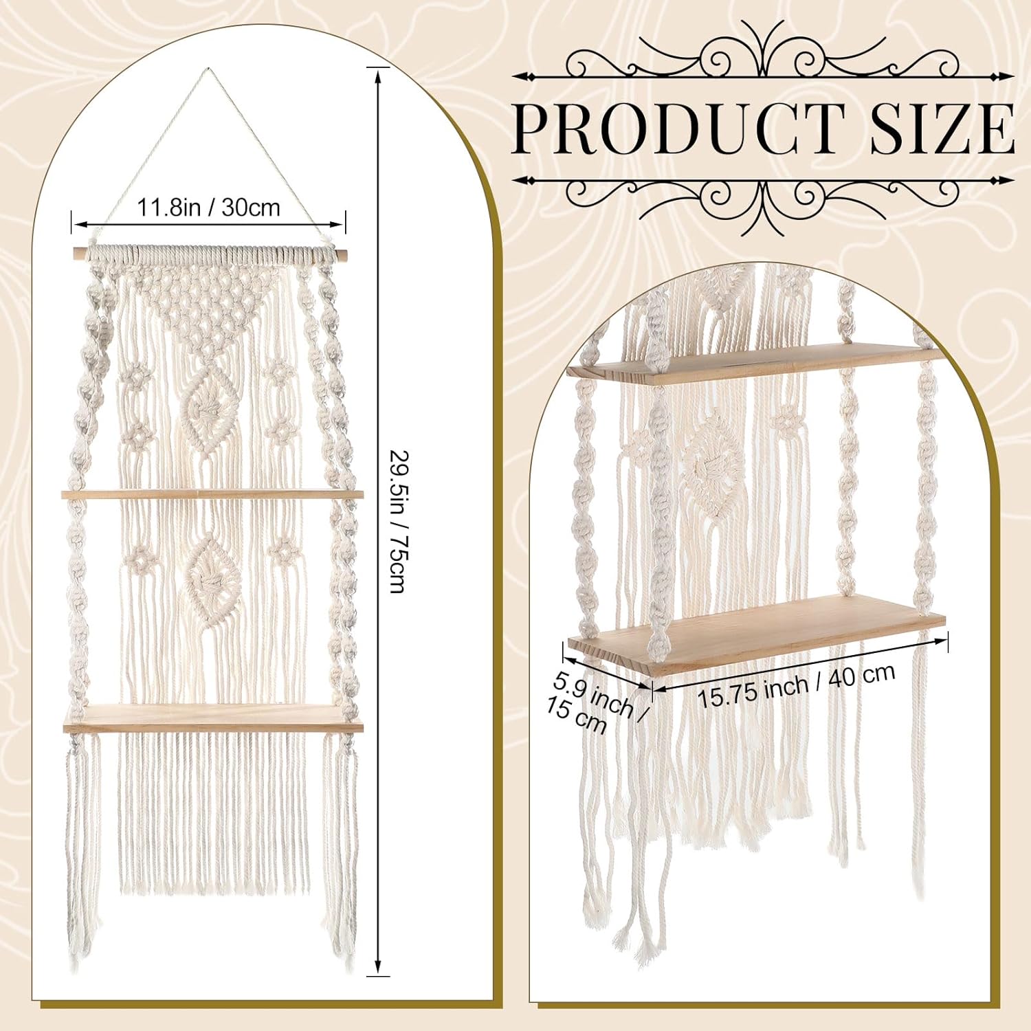 Features: 2 Tier design: The 2 tier design of these hanging plant shelves doubles the space for your decorative items, giving you more room to showcase your valued items. The 2 tier structure also enhances the product's visual appeal, making it appear more layered and spacious. They allow for versatile usage for different decorative styles or storage needs. Home decorative storage rack: As a home decorative storage rack, these macramé hanging shelves are the ideal solution for those looking to combine style with functionality. Their special design makes them a captivating addition while giving you extra storage space for small items, making your rooms tidy and organized. They allow you to conveniently organize and display your cherished items in a chic and appealing manner. Specifications: Material: wood, rope Color: beige Wood board size: about 11.81 x 5.91 inches/ 30 x 15 cm Overall height: about 29.53 inches/ 75 cm Weight: about 1.6 lb/ 720 g Package includes: 2 x Macramé wall hanging shelves Notes: Manual measurement, please allow slight errors on size. The color may exist a slight difference due to different screen displays