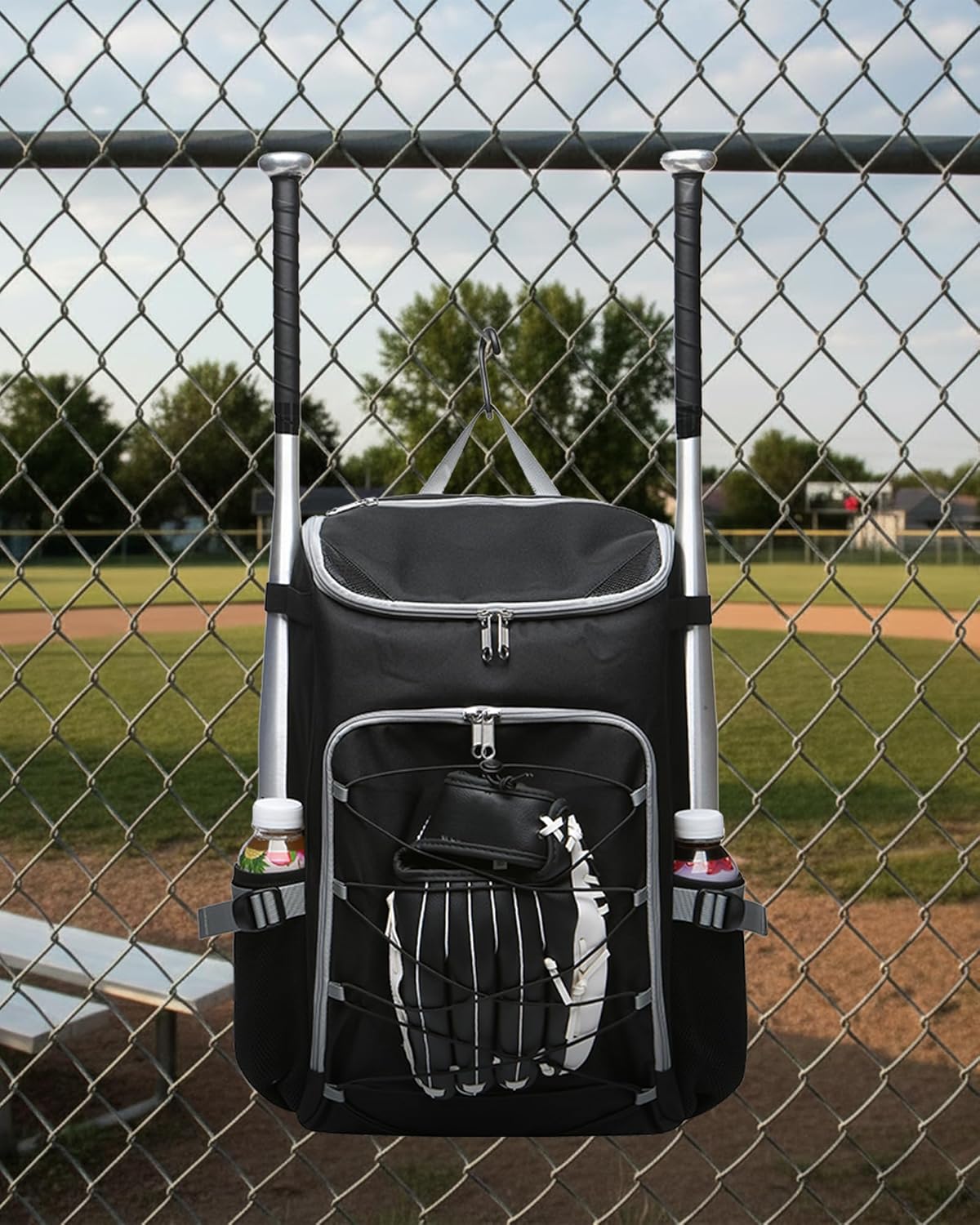 This bag is suitable for both practice and tournament storage needs. The shoe compartment has 2 mesh vents to enhance airflow. The water bottle pockets hold up to 32 oz drinks and, with the additional elastic straps, can also double as bat sleeves when empty, allowing you to carry 2 to 4 bats. A front bungee cord is for airing damp gloves or caps; 1 extra zip pocket keeps personal items separate from sports gear; 2 D-rings are for hanging keys; and smooth dual zippers ensure easy use.