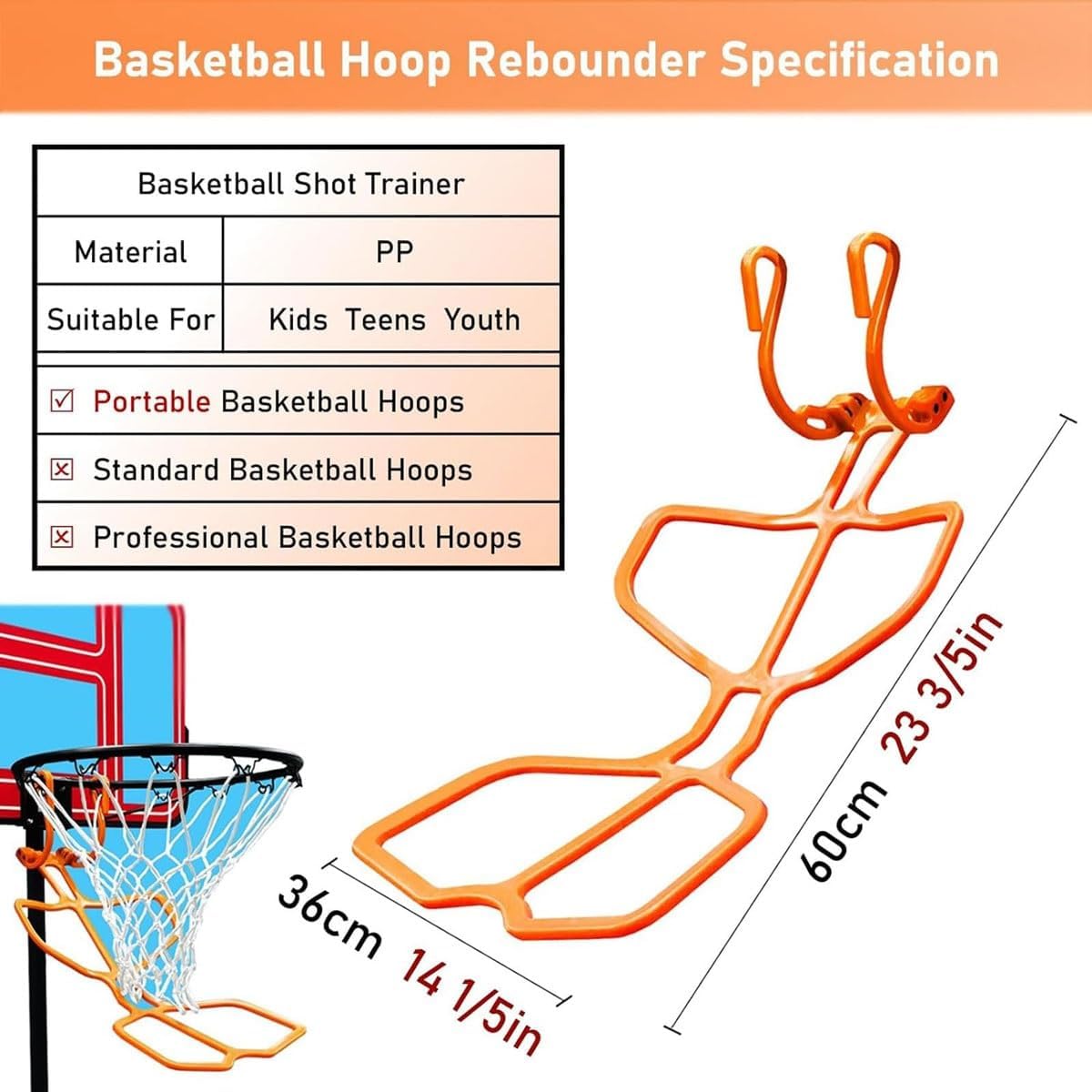 Do you keep chasing the basketball while shooting and can't focus on mechanics?Do you want to improve your shooting percentage?Do you want to get the right arc on your shot?Whether you are a beginner in basketball or a professional player who wants to practice his shooting skills, our basketball rebounder can be the perfect solution to your problem.Our basketball return attachment catches all shots, reduces time spent chasing the ball, increases shot frequency, and effectively improves shooting rate by 2-3x.Features :Durable PP frame, lightweight & stable.Cover almost all shooting angles on the court.ONLY suitable for portable basketball hoops.Multiply shooting time, making shots 80% more efficient.Easy to assemble remove store.Perfect gift for family, friends, kids who love basketball.Specification:Name:Basketball RebounderMaterial: PP PlasticColor: OrangeWeight: 1.5 kg/3.3 lbsLength: 60cm (23 3/5in)Width: 36cm (14 1/5in)Product Inclusions:1 x Basketball Shot TrainerNotes:1. Due to manual measurement, 2-3cm deviation is allowed.2. Different monitors have different calls, and the product color is subject to the actual product.