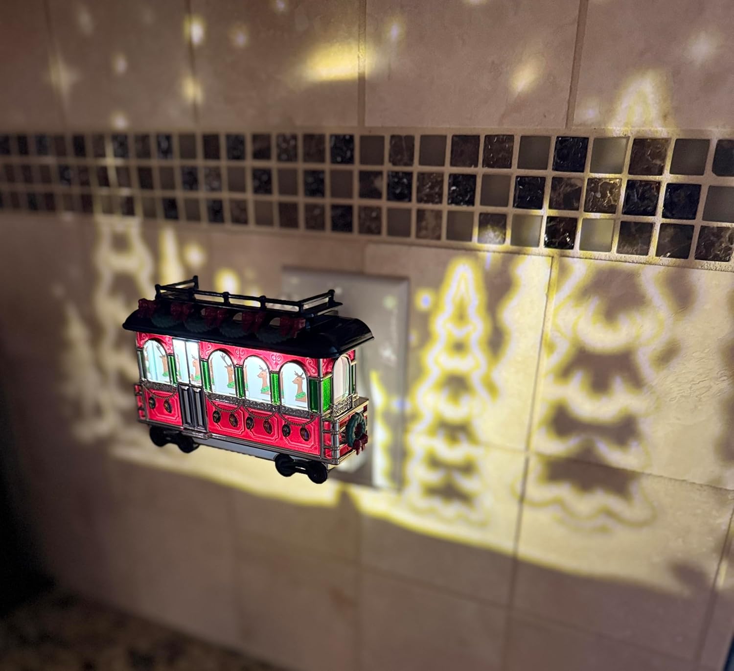 Christmas Tree Themed Trolley Projector Wallflowers Fragrance Nightlight PlugPine trees projected on wall. Adorned with ribbons, christmas lights, garland, and reindeer, this wallflowers plug gives noticeable, lasting fragrance for all your cozy gatherings this season. It also projects a white snowy tree design on the wall—so your holidays are a little more magical. What it does: wafts your favorite, always-on fragrance into any room and brightens it up at the same time. Why you'll love it: Express your excitement and joy for the holiday season...choo choo! Fills any room with noticeable, always-on fragrance Pairs with your favorite Wallflowers fragrance refills (sold separately)Twist left (counter-clockwise) to attach Fragrance Refill to Plug. THIS IS NOT A SCENT CONTROL.