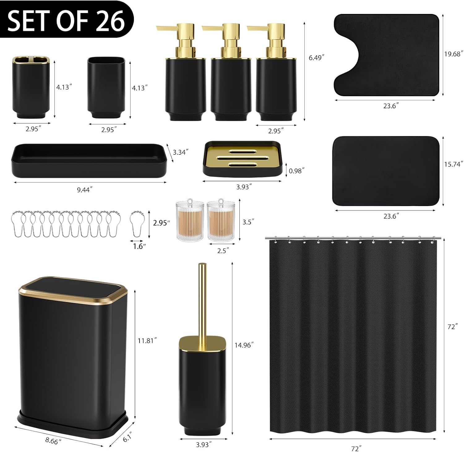 | Included Components | stainless steel trash can/3*soap dispenser/1*toilet brush/1*toothbrush holder/1*bathroom tumbler/1*vanity tray/1*soap dish/2*qtip holder/1*curtain/2*rugs/12*silver curtain hooks |