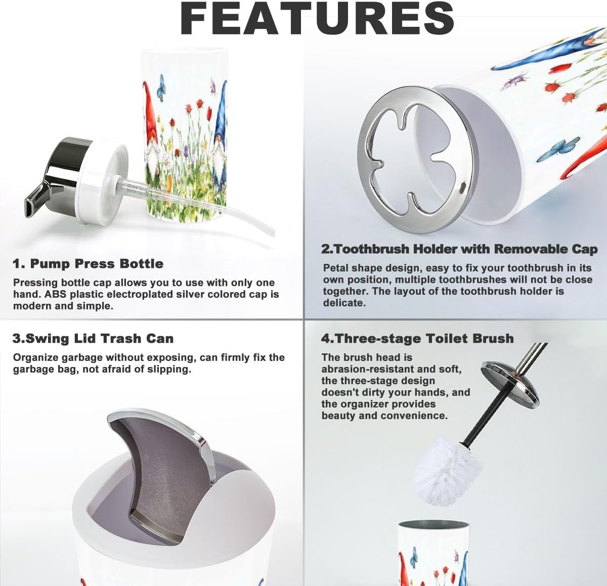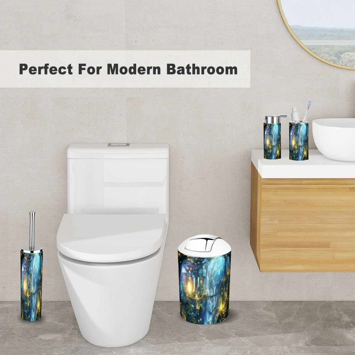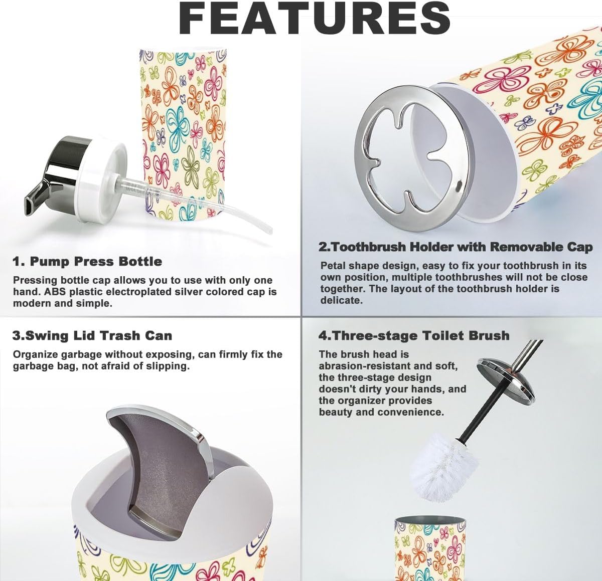 - Lotion DispenserIt can be pressed by one hand and rebound automatically. Use our soap dispenser for liquid hand soap, dish soap, lotion, shampoo, body wash, massage oils, etc.- Toothbrush Cup- Toothbrush HolderFits most sizes of toothbrushes, toothpaste, etc.- Trash CanWith swing lid, it's convenient for using.- Toilet Brush HolderHide the brush head inside the base- Soap DishIt can leak and keep dry.Please Note:1. Please allow tiny size difference for manual measurement.2. Please confirm the size before purchase.