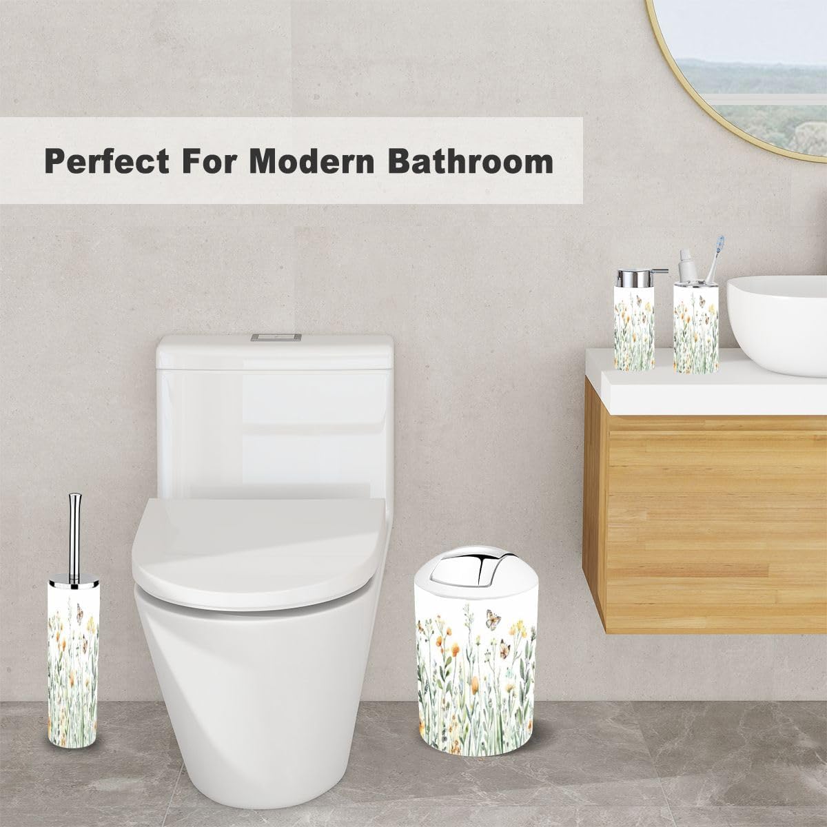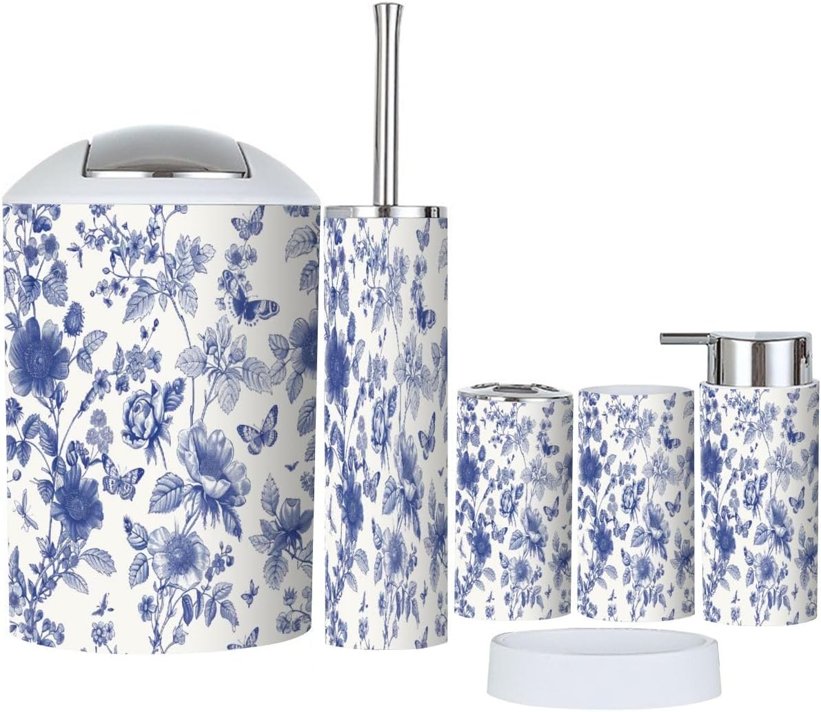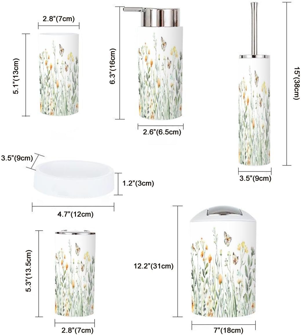- Lotion DispenserIt can be pressed by one hand and rebound automatically. Use our soap dispenser for liquid hand soap, dish soap, lotion, shampoo, body wash, massage oils, etc.- Toothbrush Cup- Toothbrush HolderFits most sizes of toothbrushes, toothpaste, etc.- Trash CanWith swing lid, it's convenient for using.- Toilet Brush HolderHide the brush head inside the base- Soap DishIt can leak and keep dry.Please Note:1. Please allow tiny size difference for manual measurement.2. Please confirm the size before purchase.