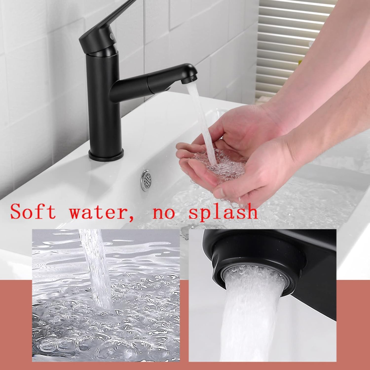 Touch On FaucetsThis is an ergonomic pull out faucet design that is practical and durable. Simple and elegant in appearance, it adds elegance to your bathroom.Specification:Installation type: sittingApplicable type: basin, bathroomFunctional Category: Mixing Faucet for Hot and Cold WaterColour: Blackstyle: modernMaterial:Main material: copperInlet pipe material: stainless steelSpool type: ceramic spoolProduct Size:Installation aperture: Φ33-37mmInlet and outlet pipe diameter: 60cm*2,G1/2Features:1. The 360° rotatable water outlet provides absolute flexibility and maneuverability, making it easier for you to wash your hair and face.2. The single lever design makes it easier for the pull out faucet to adjust the water flow and temperature. Perfect for your sink.3. Pull-out spray: The Pull out Bathroom basin tap hose allows you to use the space more freely.Premium Accessories:1. Soft aerator, sufficient water and air, even water, no splashing water, make your room cleaner.2. Gravity Ball Design: Basin pull out faucet with gravity ball makes it easy to pull out. It also ensures smooth retraction of the hose after each use.Package Included:1 * pull out faucet1 * Gravity Ball2 * water inlet pipes (hot and cold)