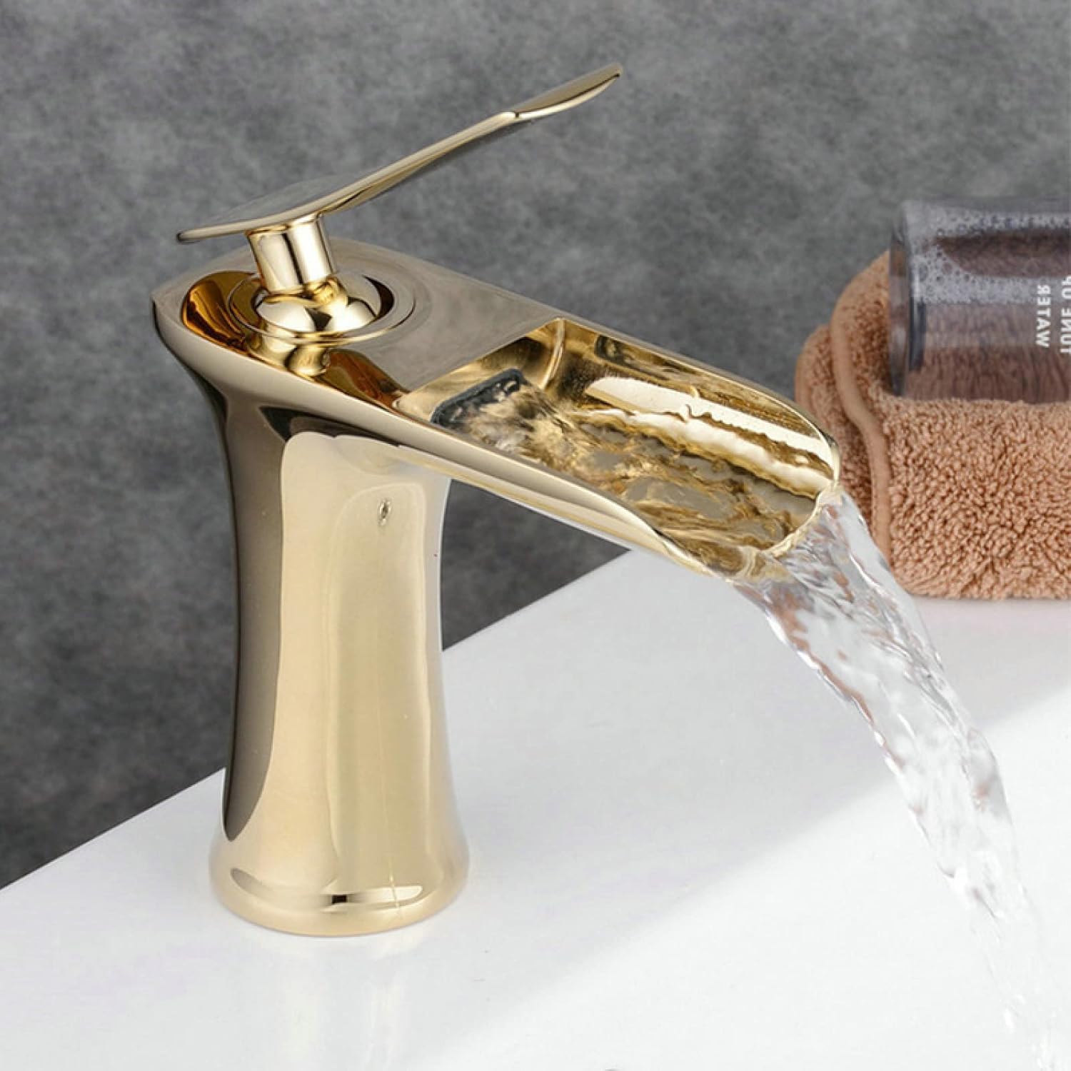 FaucetsThe Waterfall Bathroom Faucet impresses with its quiet and gentle water jet. Faucets reduce unsightly water stains and provide comfortable water pressure. Product specifications: Product name: Waterfall Bathroom Sink Faucet gold Material: brassSize: short, highSpool type: ceramic plate spoolnumber of holes/operation type: single hole/single handle faucetApplication: hot and cold water supply. Product parameters: Valve seat diameter: 3.5CMWorking temperature: 0-90°Installation aperture: 3.2-4CMinlet and outlet pipe diameter: G1/2outlet length: 160MMPlease refer to the dimensional drawing for detailed dimensions. Note: The dimensions are all measured manually, there may be some errors, and the actual product is the main thing. Product features: 1, waterfall exit: create a visually pleasing waterfall effect. 2, brass material: strong and durable, so that the bathroom sink faucet can be used for a long time. 3, one-hand control: hot and cold water can be adjusted through one handle. 4, ceramic spool: tightly sealed, high temperature resistance, to ensure long-term use without dripping or leakage. about delivery: 1 x single handle basin faucet2 x flexible connection hoseothers: mounting accessories