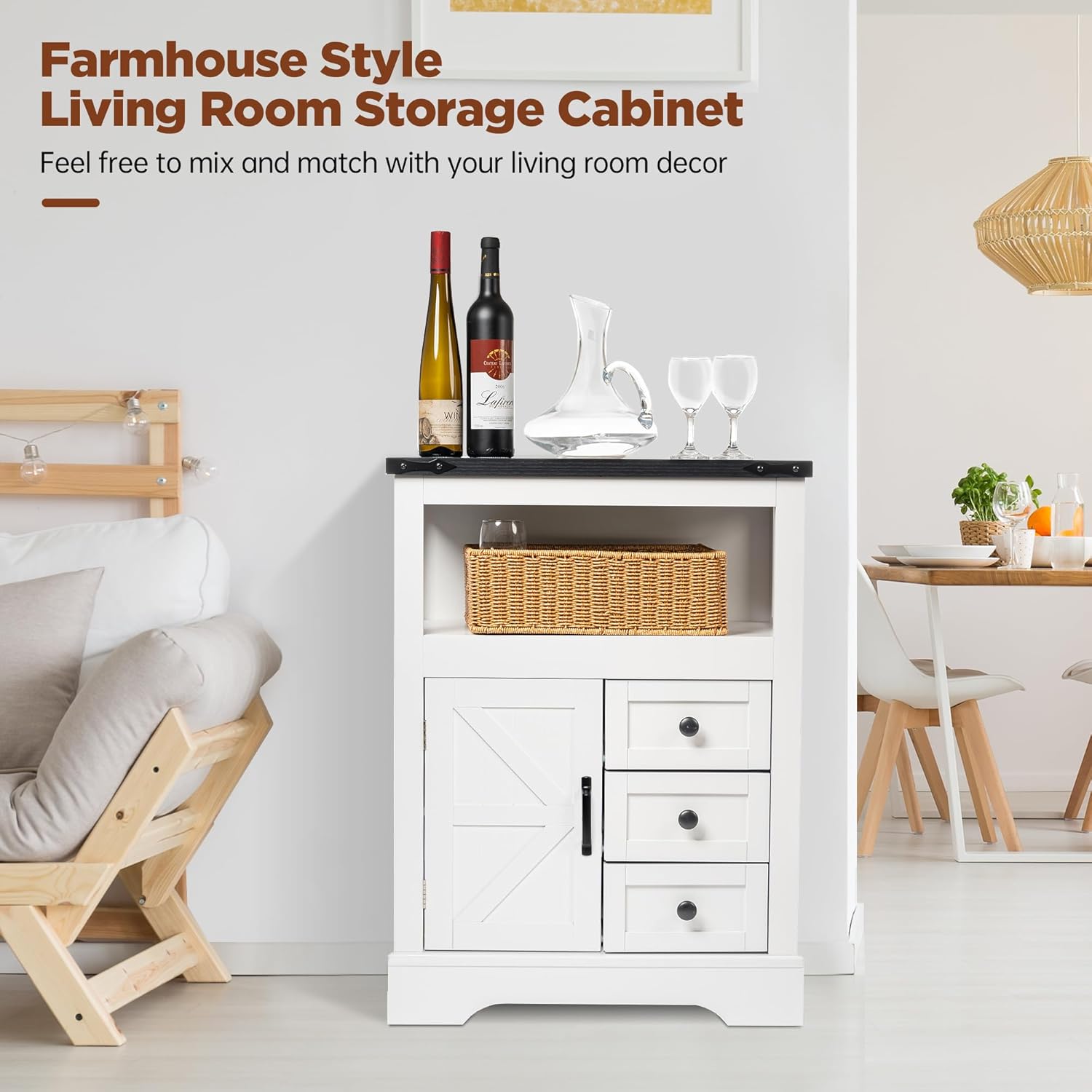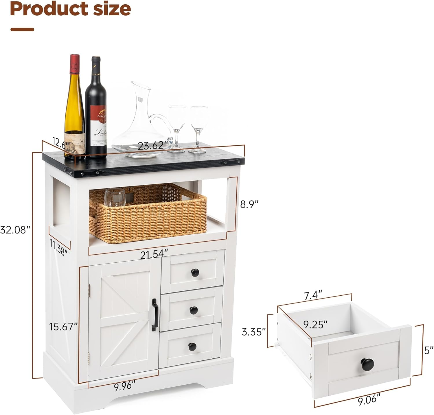 | Storage Options | 3 drawers, 2 open shelves, 1 enclosed cabinet |