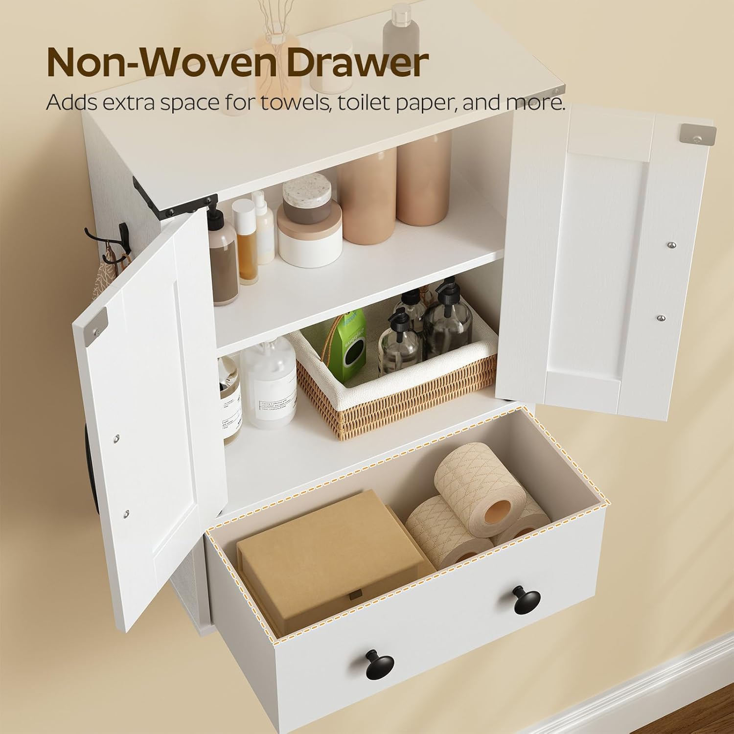 Bathroom Wall Cabinet, Medicine Cabinet with Fabric Drawer, Double-Door Wall Mounted Storage Cabinet, 2 Hooks, Over The Toilet Space Saver Storage Cabinet, Bathroom Wall Cabinet with Mirror, Medicine Cabinet Mirror, Wall Mounted Medicine Cabinet, Mirrored Door Over The Toilet Storage, for Laundry Room, Bedroom, Camper, Hallway