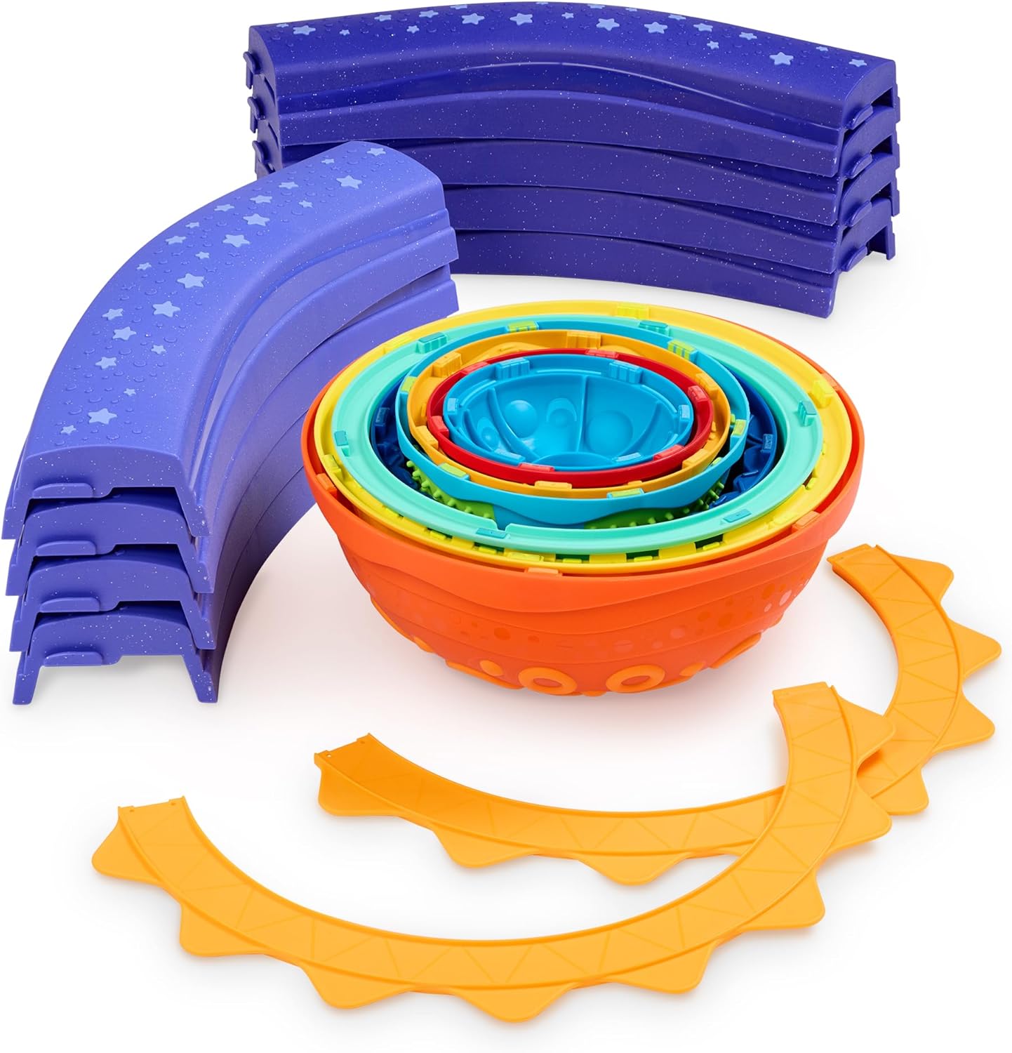 Step, balance, and blast off! Bring outer space under your feet with the Step & Feel Solar System™! This sensory-rich set features 8 textured stepping stone planets, 8 easy-to-connect balance beams, and a giant two-piece Sun ring. Little astronauts can arrange endless obstacle courses, discover tactile textures, and explore space facts on 9 double-sided course cards! The included play guide unfolds into a colorful poster of the solar system—making every play session a cosmic adventure. Build gross motor skills, coordination, and STEM learning… and feel the universe, one step at a time!