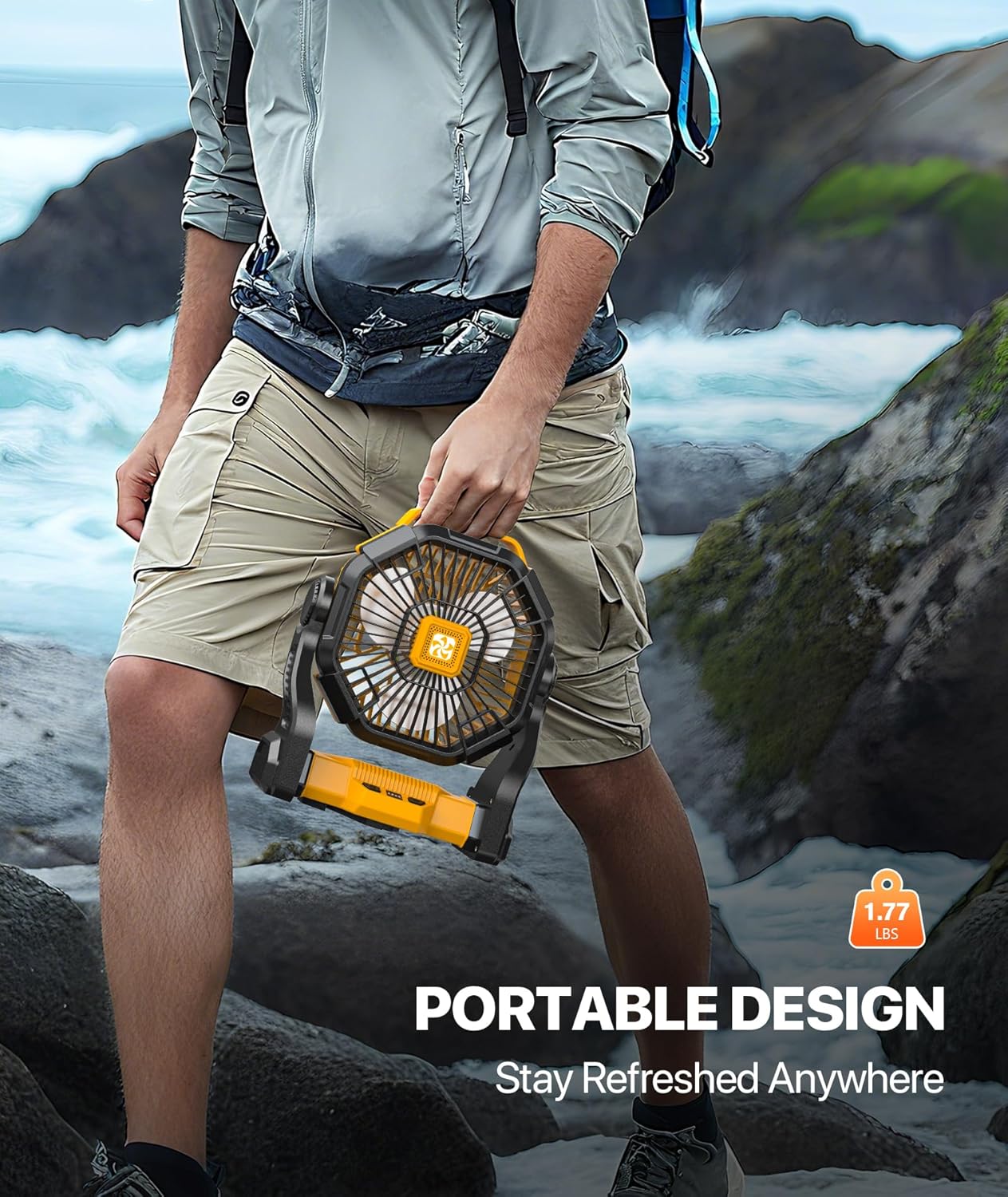 The outdoor portable fan for camping has a Hook that can rotate 360 degrees. You can hang the fan up and adjust the right angle. Hang it in a tent, tree branch, or vehicle. Easily adjust the fan to the optimal blowing angle. Suitable for office desks, dining tables, cars, and floors.