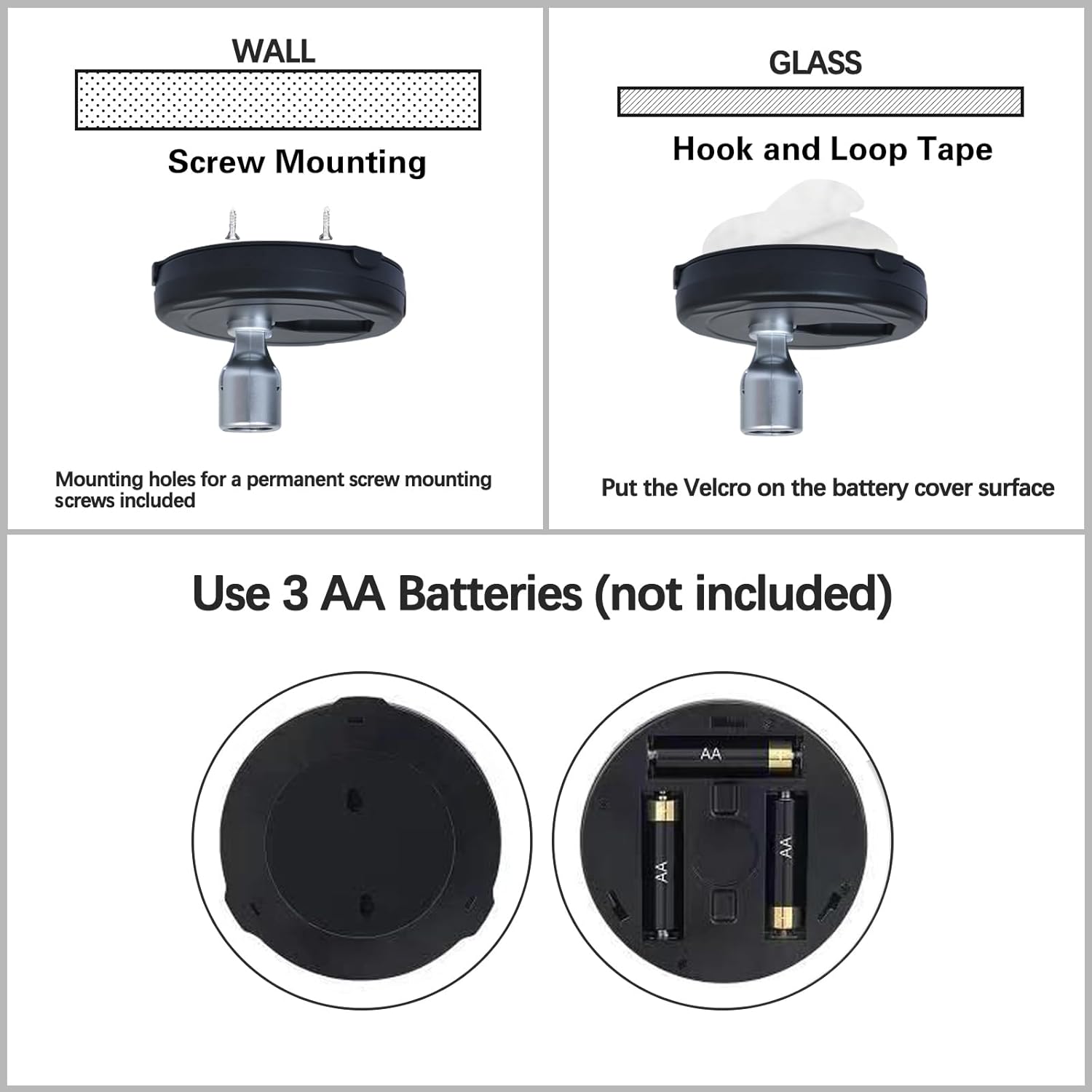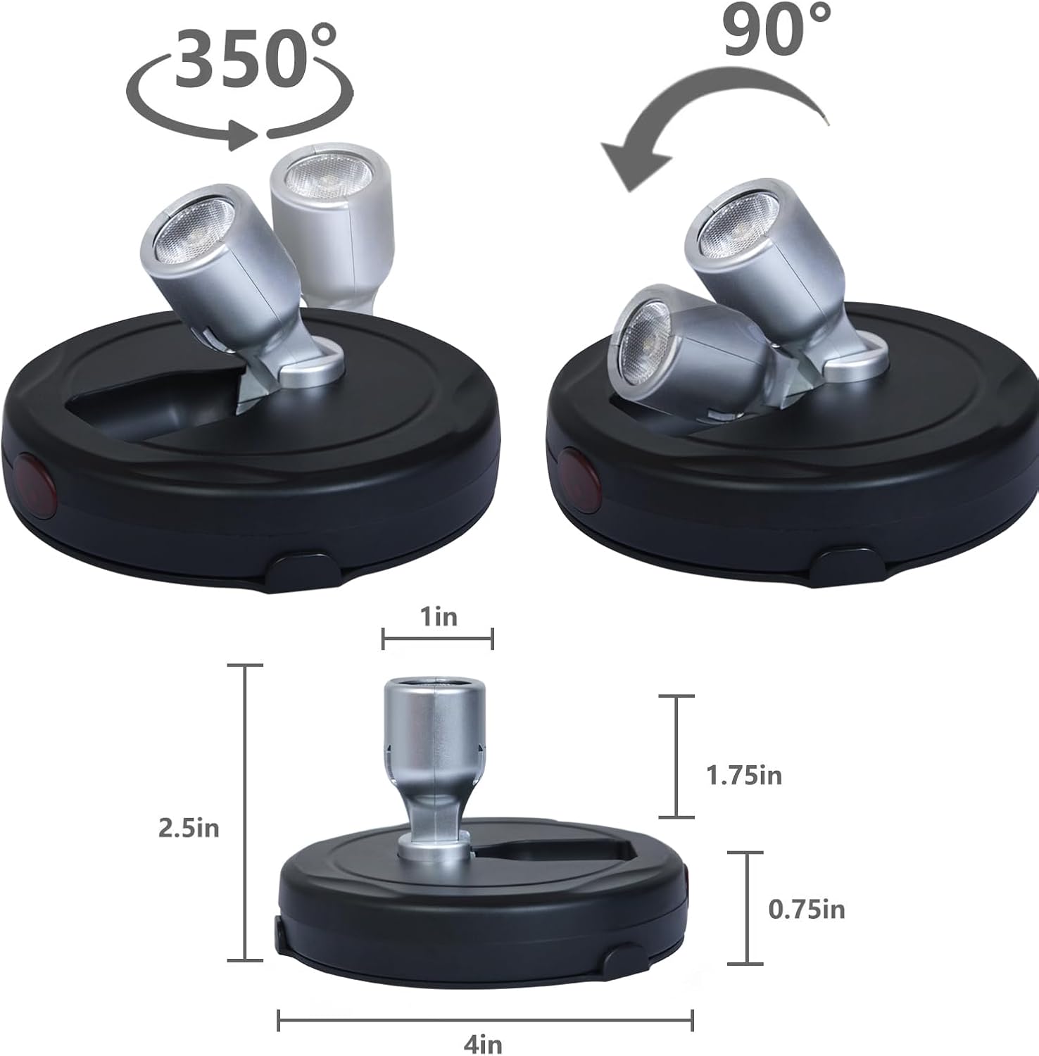 Lumens: 80LM Wattage: 0.6W Powered: 3 AA batteries (not included) Run times: 50 hours Lifespan: 30000 hours Color Temperature: 3000K warm white light Light Head Rotatable: 350°& 90°(height adjustment) Brightness Level: 50% -100% Timing: 15, 30, 60, 120 minutes PACKING LIST - 4 x LED Spotlight - 2 x Remote Control - 4 x Hook and Loop Tape - 8 x Screws - 1 x User Manual