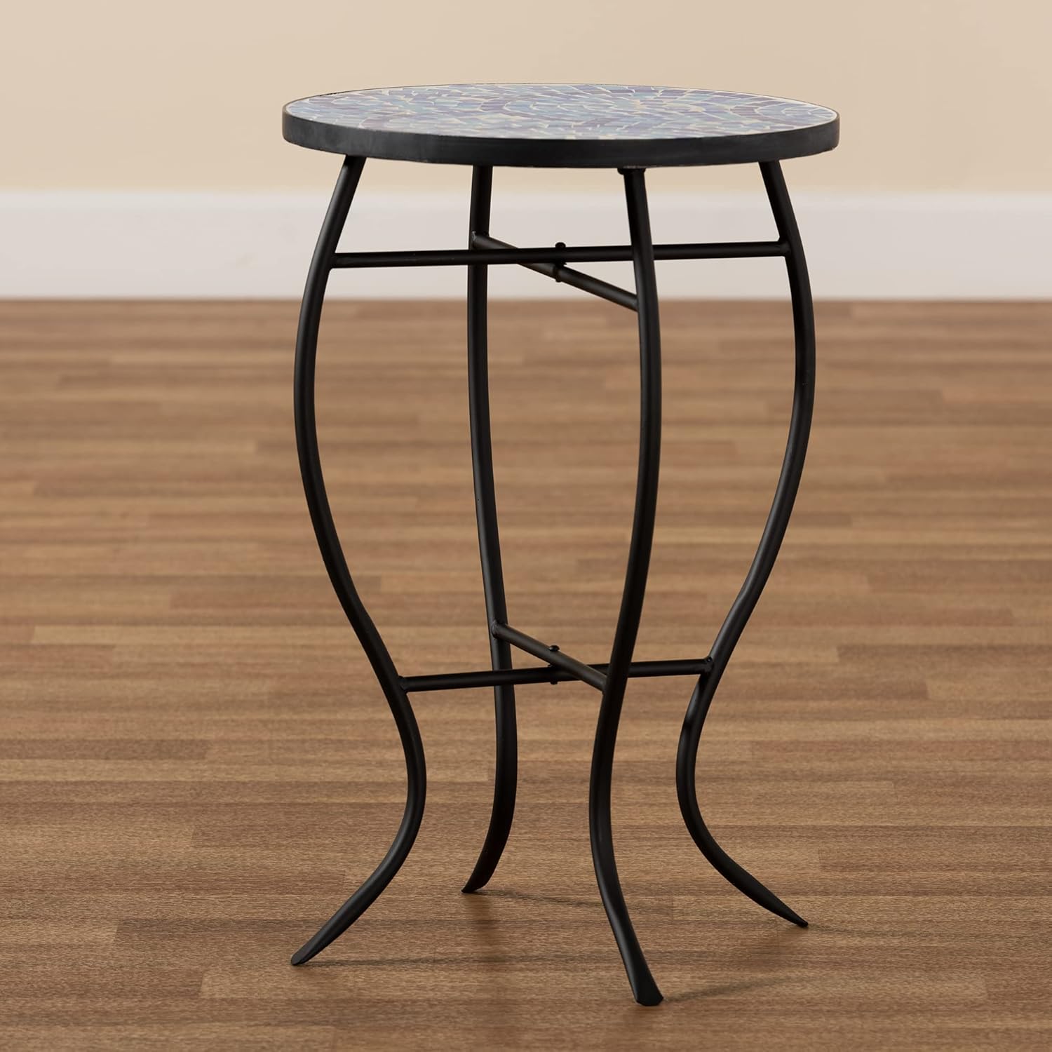 Craft a beautiful garden scene with the exquisite Gaenor plant stand. Made in China, this stand is constructed from metal featuring a sleek black finish. Its round tabletop is adorned with glass accents of various blue shades to create a cool, mosaic display. The Gaenor will arrive fully assembled and is supported by cabriole legs for excellent stability in elegant style. A fantastic addition to any outdoor lounge, the Gaenor plant stand is sure to leave an impression.