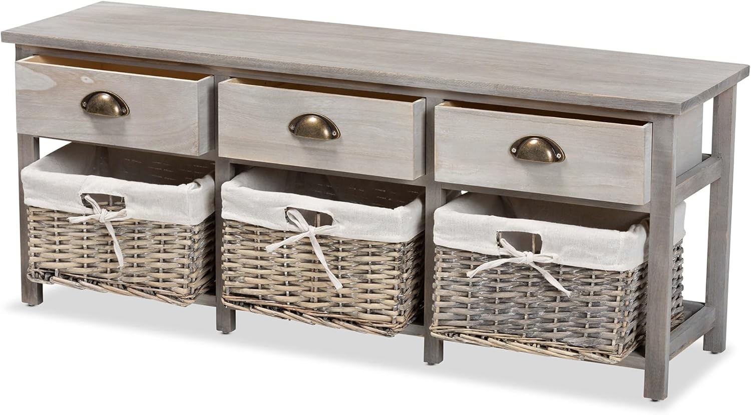 Develop your entryway with the modern convenience of the Mabyn storage bench. Made in China, this bench is comprised of a sturdy wood frame fitted with wicker baskets. Three drawers and three baskets expand the storage potential of any space while smooth metal drawer knobs adorn the bench with industrial charm. The Mabyn will arrive fully assembled and utilizes fabric liners in its baskets for a contemporary touch. A versatile addition that exudes modern charm, the Mabyn storage bench elevates the potential of any space.Features:- Modern and contemporary storage bench- Constructed from paulownia wood and MDF- Three (3) drawers and three (3) baskets- Metal drawer handles- Wicker baskets with fabric liners- Fully assembled- Made in ChinaSpecifications:- Product Dimensions: Overall Dimensions: 16.50" High x 42.10" Wide x 11.40" Deep; Legs: 1.80" High;