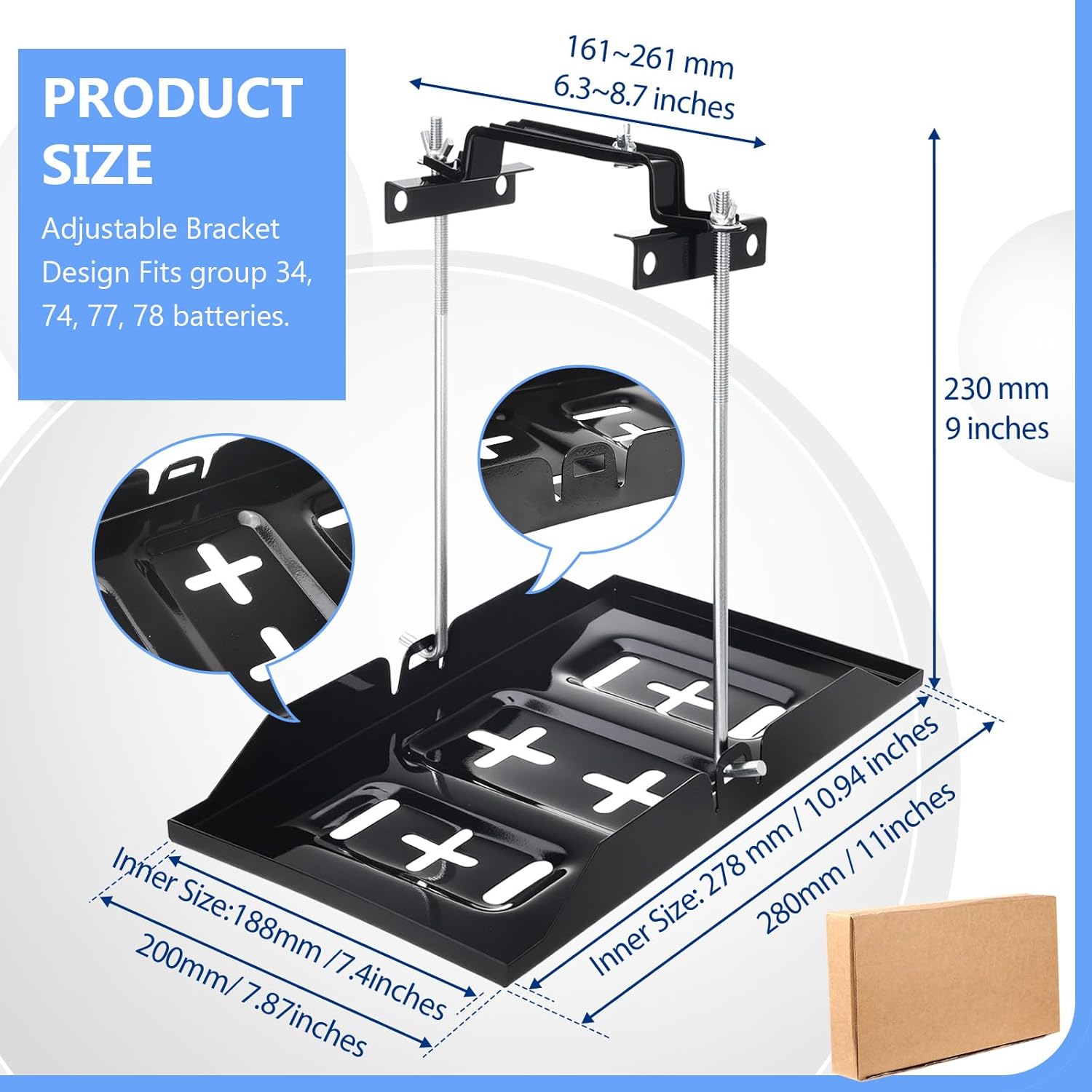 Features: Double the convenience: Coming in a set of two, you can replace two old battery holders at once, or keep a spare set in your garage. Safety and Compatibility: Two-piece universal car battery hold down and Clamp Kit is designed to secure batteries and prevent dangerous shifting in any vehicle. These kits contain two 11 x 7.87 inch/ 28 x 20 cm trays and adjustable clamps to fit most standard car battery packs. Specifications: Size: 9" Bolt With 10" Battery Tray Material: metal Color: black Package Included: 2 x Universal battery hold down kits Warm notes: Manual measurement, please allow slight errors in size. The color may slightly differ due to different screen displays.