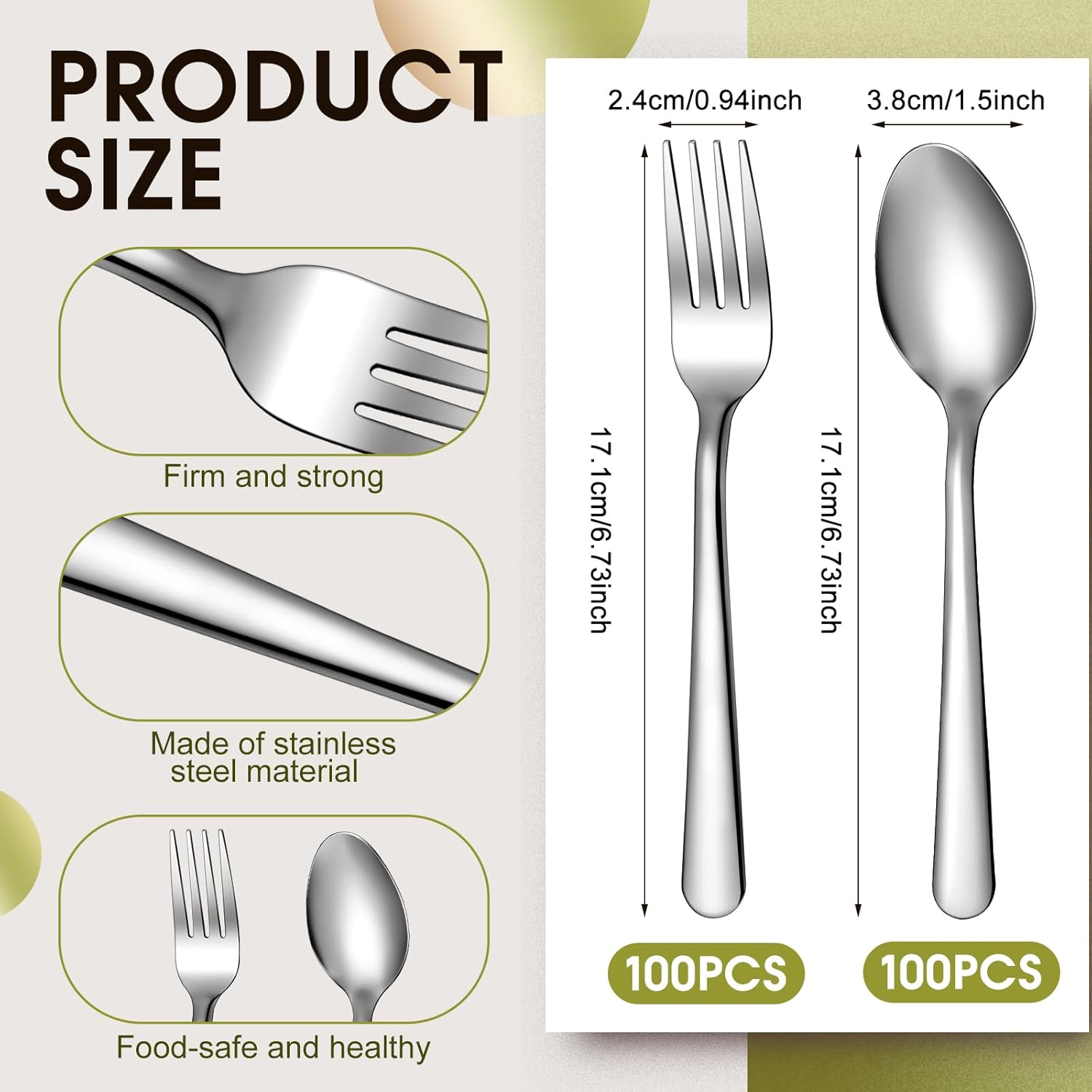 Features: The stainless steel flatware cutlery sets are comfortable to hold in hands and won't fall off easily, besides they conform to the aesthetics of most people. The silverware forks and spoons are convenient for you to clean, simply put them in the dishwasher after use, or rinse them with mild water, which can save effort for you. Specifications: Material: stainless steel Color: silver Size: approx. 7.1 inches/ 18 cm in length Package includes: 100 x Forks 100 x Spoons Notes: Manual measurement, please allow slight errors on size. The color may exist a slight difference due to different screen displays. Pointed items are included, so please keep them away from little kids Pointed items are included, please be careful when using and please keep them away from kids