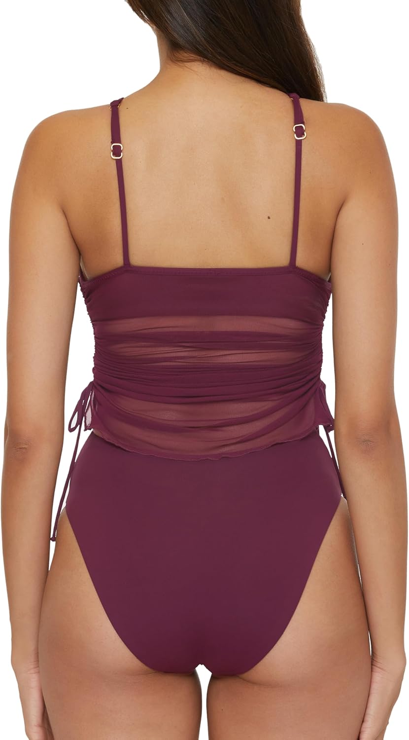 The BECCA Muse Women's High-Neck One Piece Swimsuit marries elegance and functionality with its unique high-neck mesh overlay and alluring plunge cut-out underlayer. Adjustable features such as the back straps and side ties provide a tailored fit, while the removable cups and elastic underbust offer necessary support. Perfect for the modern woman seeking a blend of style and comfort, this swimsuit is ideal for any beach, resort, or pool setting.