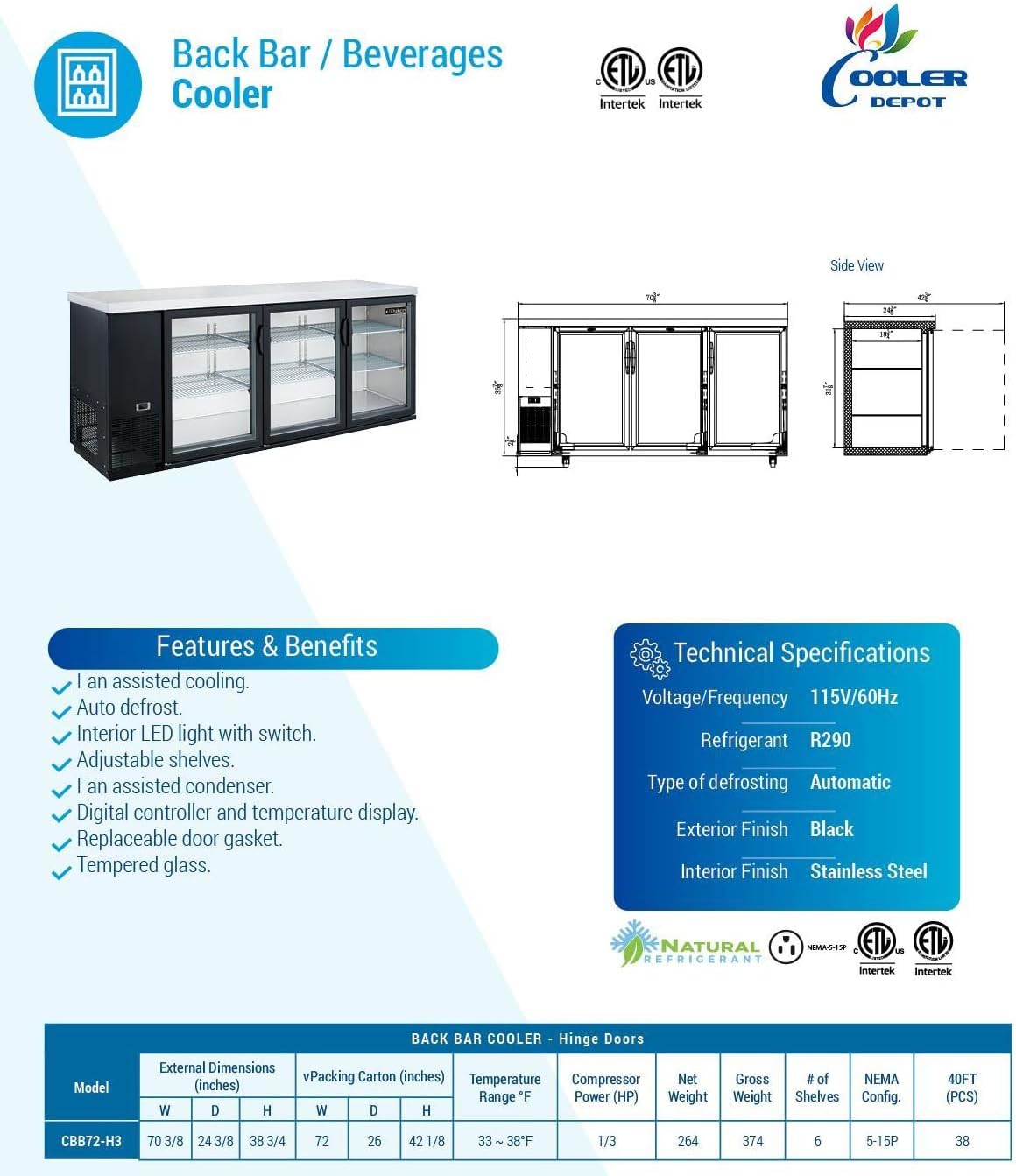 Beer Back Bar Cooler 72" Commercial Refrigerator NSF Display Cooler 3 Glass door 20 Cu.ft CBB72H LARGE CAPACITY: This item has Dimension of 72"LX26"DX42"H, weighted 260 lbs, it provides 20 cu. ft. of interior storage space, and houses 6 shelves that each accommodate up to 90 lb. The epoxy-coated steel shelves are perfect for storing and organizing beverages for your bar service, from bottles of ale and beer to cans of crisp ciders. SWING Door: between This back bar refrigerator's self-closing, glass door includes a key lock and magnetic door gaskets for positive door sealing. The tempered glass door also makes it easy to see the contents of the unit so you know when it's time to restock the shelves! The Adjustable shelves allow you to easily organize the back bar refrigerator's beer, soda, or mixers for faster service on busy nights. Using the 110V Electricity, total input power of 360 Watts this back bar cooler has a temperature range of 33-38°F. Featured with Environmental Friendly R290 Refrigerant, Fan assisted cooling, Digital controller and temperature display and automatic Defrosting system make it easy to use. DURABLE CONSTRUCTION: A wear-resistant, vinyl on steel, black finish provides a durable exterior, while the galvanized steel interior walls and ceiling, stainless steel floor and doorsills provide corrosion resistance and long-lasting durability.