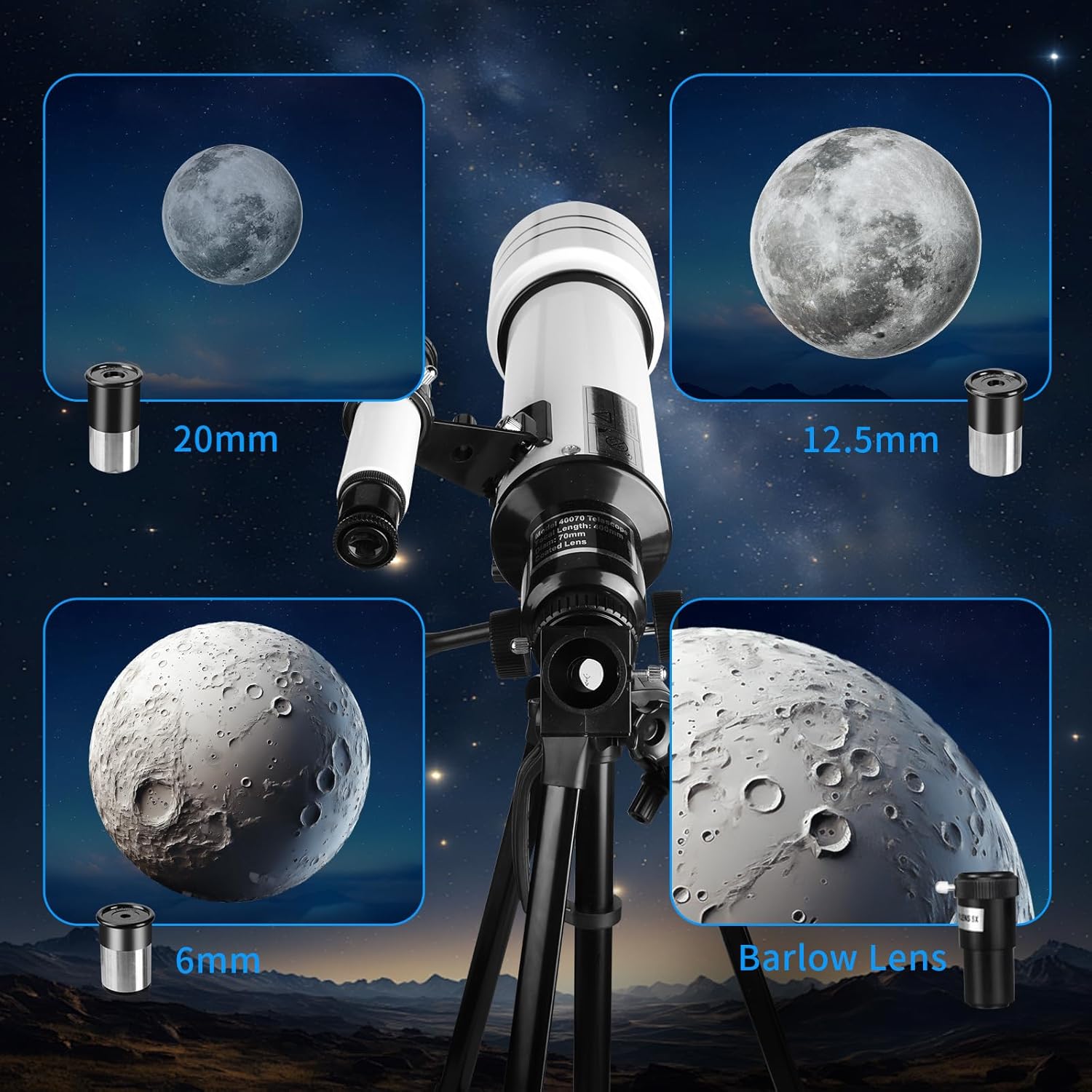 | BuiltIn Media | 1 x 3x Barlow Lens, 1 x Lightweight Tripod (stable support for stargazing/moon viewing), 1 x SVylthorix F70400M Astronomical Telescope (Main Body), 1 x Telescope Carry Bag (easy storage and portability), 3 x Interchangeable Eyepieces |