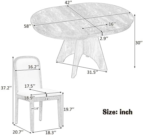 Bellemave 5-Piece Extendable Round Dining Table Set with 4 Upholstered Chairs, 42"-58" Round Kitchen Table Set for 4-6 with Removable Leaf and Crossed Legs for Kitchen, Dining RoomThis round dining table set featuring practical extendable performance, with curved edges, wood grain and subtle hardware making it a retro statement piece of classic appeal. This extendable round dining table realizes multi-functional living with a hidden drop-leaf extension from 42” to 58” with a 16” middle leaf, a vintage space-saving design. It turns from a 4-seater for coffee to a 6-seater for family dinners. It’s a space-efficient solution combining practicality and convenience. This round kitchen table supporting up to 250 lbs. Its crossed table legs form a stable triangular structure, eliminating wobble for long-term use. The tabletop boasts natural solid wood grain and unique grooved details, enhancing visual texture. Chair captures the iconic retro curved-back design that is people-friendly, with slender solid wood slats balancing lightness and sturdiness (supports up to 300LBS). Upholstered in soft, durable linen fabric, the contoured seat offers ergonomic comfort. Solid wood legs with anti-slip pads prevent wobble. Their compact profile tucks under the table, saving space, while the curved-back adds vintage charm matching the table. Weight & Dimensions:Table Dimensions:58''L x 42''W x 30''H/92.4 LBS Chair Dimensions:18.9''L x 20.7''W x 37.2''H/16.5 LBS Weight Capacity (Table/Chair):250/300 LBS Package Number:2 Specifications:Product Type:Dining Table Set Product Size:42"-58" Product Color:Natural Wood Wash/Espresso Product Material:Solid Wood+MDF Top & Legs Material:MDF+Oak Veneer Chair Frame:Rubber Wood Country of Origin:Vietnam Assembly Required:Yes Additional Tools Required:All Tools Included