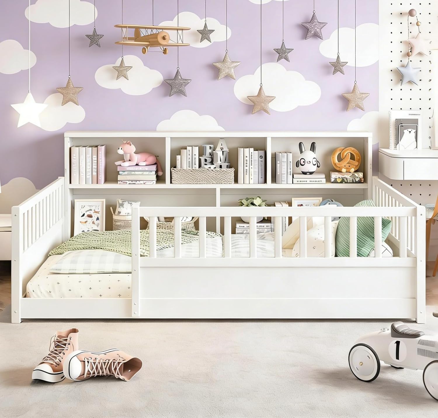 Introducing the Full Size Wood Floor Bed Frame with Bookcase and Guardrails for Kids—a versatile 2-in-1 solution that combines safety, functionality, and timeless design. Expertly crafted from premium solid pine wood, this Full Montessori Floor Bed ensures lasting durability with its sturdy construction, built without slats for enhanced stability and safety. Its thoughtful high guardrail design and integrated beside shelves provide secure rest, ample storage, and a creative play space. Designed for easy assembly, it arrives as a complete package ready to quickly transform any room into a cozy, organized haven for both boys and girls.