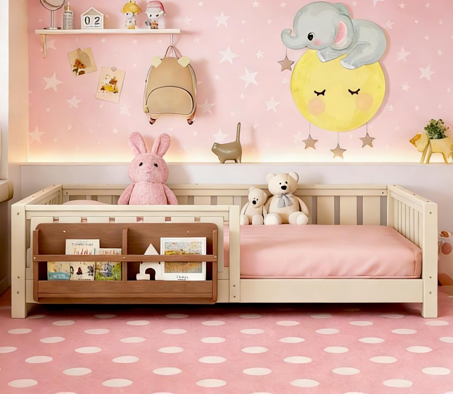 Bellemave Full Size Floor Bed Frame with Bookcase and Full-Length Guardrail, Pine Wood Montessori Bed, for Kids,No Box Spring Needed(Full,Beige,Bookshelf)