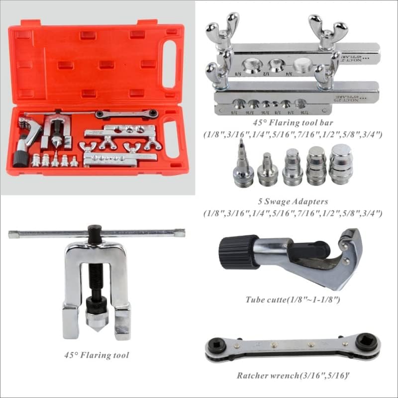 BOX WITH 45º FLARING TOOL AND TUBE EXPANDER. SIZES: 1/8‘, 3/16’, 1/4‘, 5/16’, 3/8‘, 7/16’, 1/2‘, 5/8’ AND 3/4’. DOUBLE JAW