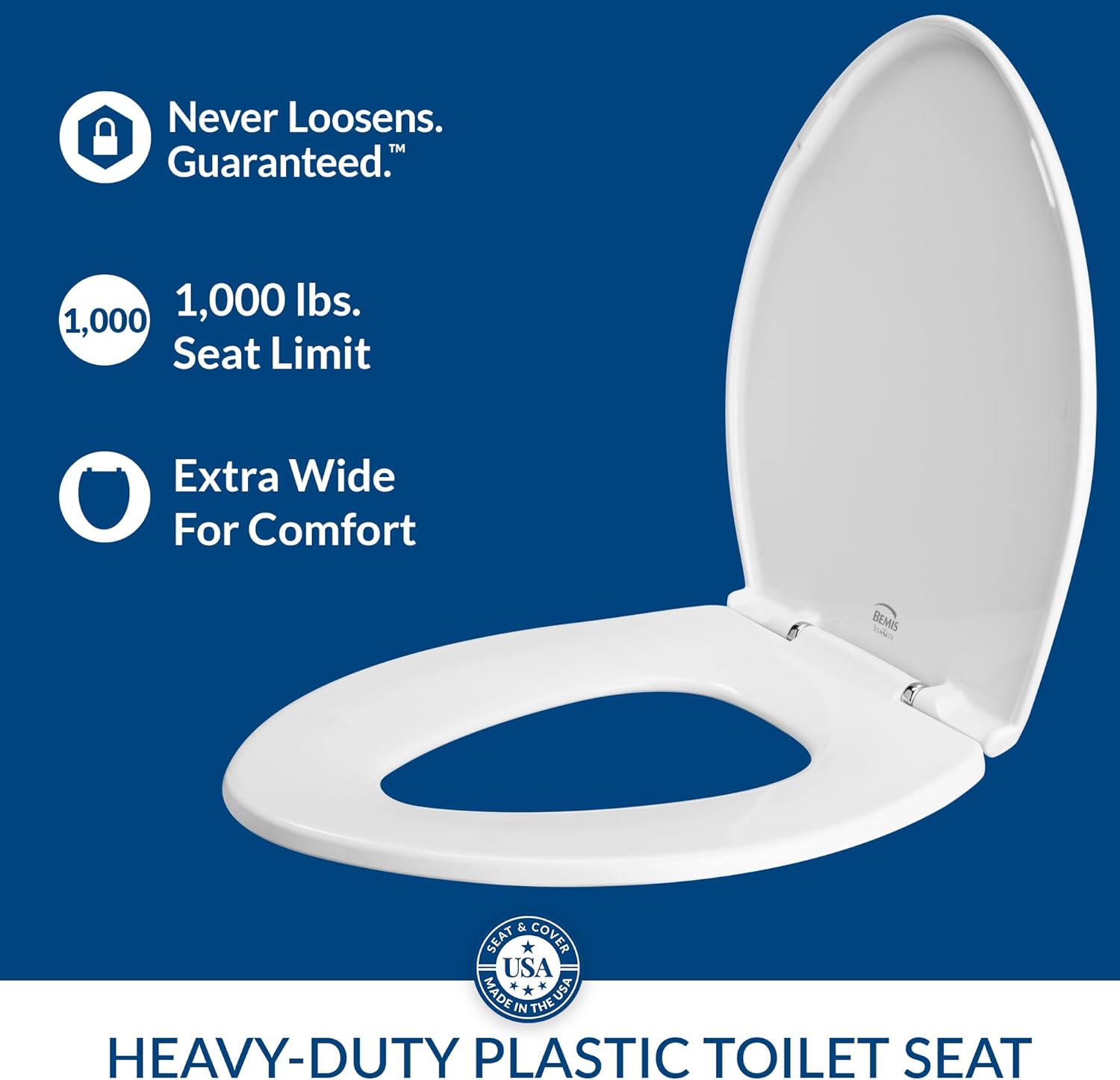 Product Description This BEMIS oversized closed front toilet seat with cover is made from heavy-duty, injection moulded solid plastic and allows for bariatric comfort and security with more surface area with this oversized seat that has a weight capacity of 1, 000 lbs subject to the weight limit of the associated toilet. The seat features four moulded-in bumpers, non-corrosive 300 Series stainless steel posts and pintles, STAY-TITE Commercial Fastening System and a 2-Position hinge that allows adjustment to either a round or elongated toilet bowl. This seat complies with IAPMO/ANSI Z124. 5- 2013 Plastic Toilet Seats as a class Commercial Heavy Duty. NOTE: Colours on a website or printed from a website can vary drastically from the actual colour of the toilet seat due to monitor and printer settings. The colours on this page are for approximate visual use and should not be used to match colours exactly to a toilet bowl. From the Manufacturer About Bemis – Bemis toilet seats bring quality, innovation and style to residential and commercial properties worldwide. Bemis toilet seats provide a wide variety of designs to easily integrate into any bathroom. The needs of residential and commercial customers are at the forefront of design with unmatched features and benefits that make everyday lives easier. Bemis Manufacturing Company is the world’s largest manufacturer of toilet seats. Founded in 1901, and in the fourth generation of family ownership, Bemis has grown from a maker of furniture and wooden wagons to an international enterprise with manufacturing and warehousing facilities worldwide. In addition to manufacturing toilet seats, Bemis is one of North America’s top non-automotive producers of contract plastic injection-molded components. With a continued commitment to the worldwide community, Bemis Manufacturing Company strives to set the standard for ecological responsibility, conservation and preservation.