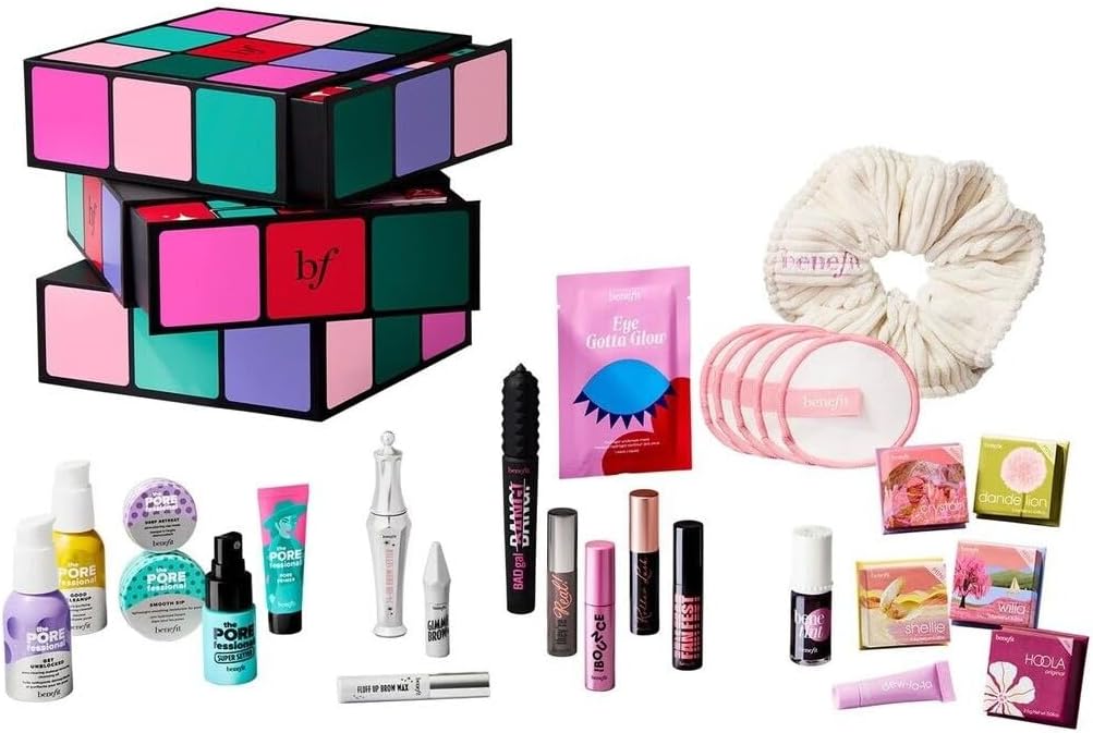 Benefit - Glam Cube Make Up & Care - Advent Calendar 2025 Limited Edition Are you ready to ignite 24 days ultimate holiday glamour with the Glam Cube advent calendar from Benefit Cosmetics? The Glam Cube is a beauty puzzle that you can solve this season - each door reveals a full-size surprise, mini or fun size that enhances your routine and lets you shine all season long. From legendary full-size must-haves to popular minis, every spin brings you closer to your best beauty wins. There are no wrong traits here, just a winning glam every day! What is included? - BADgal BANG! Volumising mascara, original size - Benetint Rosé lip and cheek tint, original size, 24-HR brow setter, invisible eyebrow gel for shaping and fixing, original size, hoola powder bronzer in original colour, mini - willa blush in delicate pink, mini - shellie blush in soft pink with mother-of-pearl shimmer, mini - dandelion. Baby-Pink WhitWhither baby endes Blush | Mini - Crystah Strawberry Pink Blush | Mini - The POREfessional Smoothing and Pore-Refining Face Primer | Mini - The POREfessional Smooth Sip Smoothing Moisturiser | Mini - BADgal Bounce Volumising Mascara with Double Sided Brush in Pump'd Up Black | Fun Size - The POREfessional Super Setter Makeup Fixer spray - and many more surprises!
