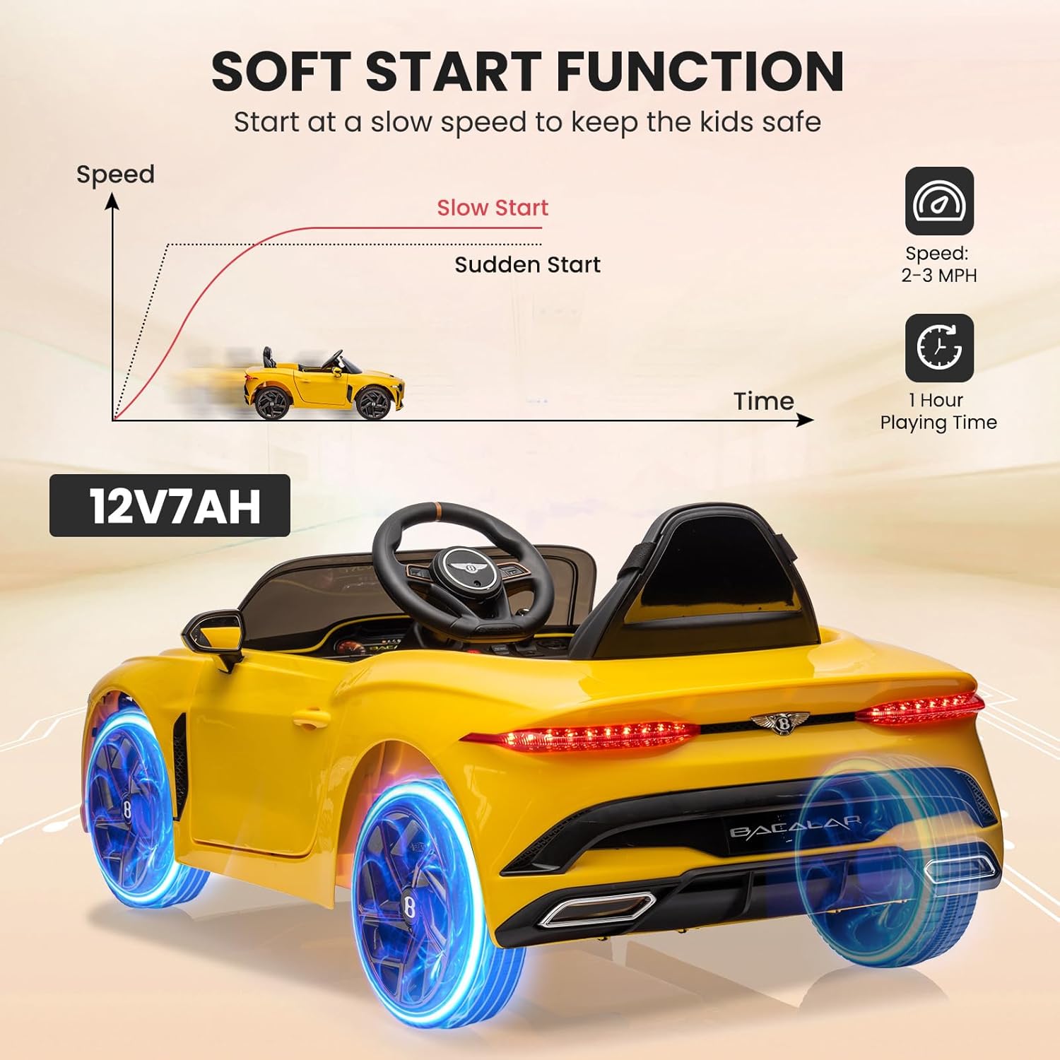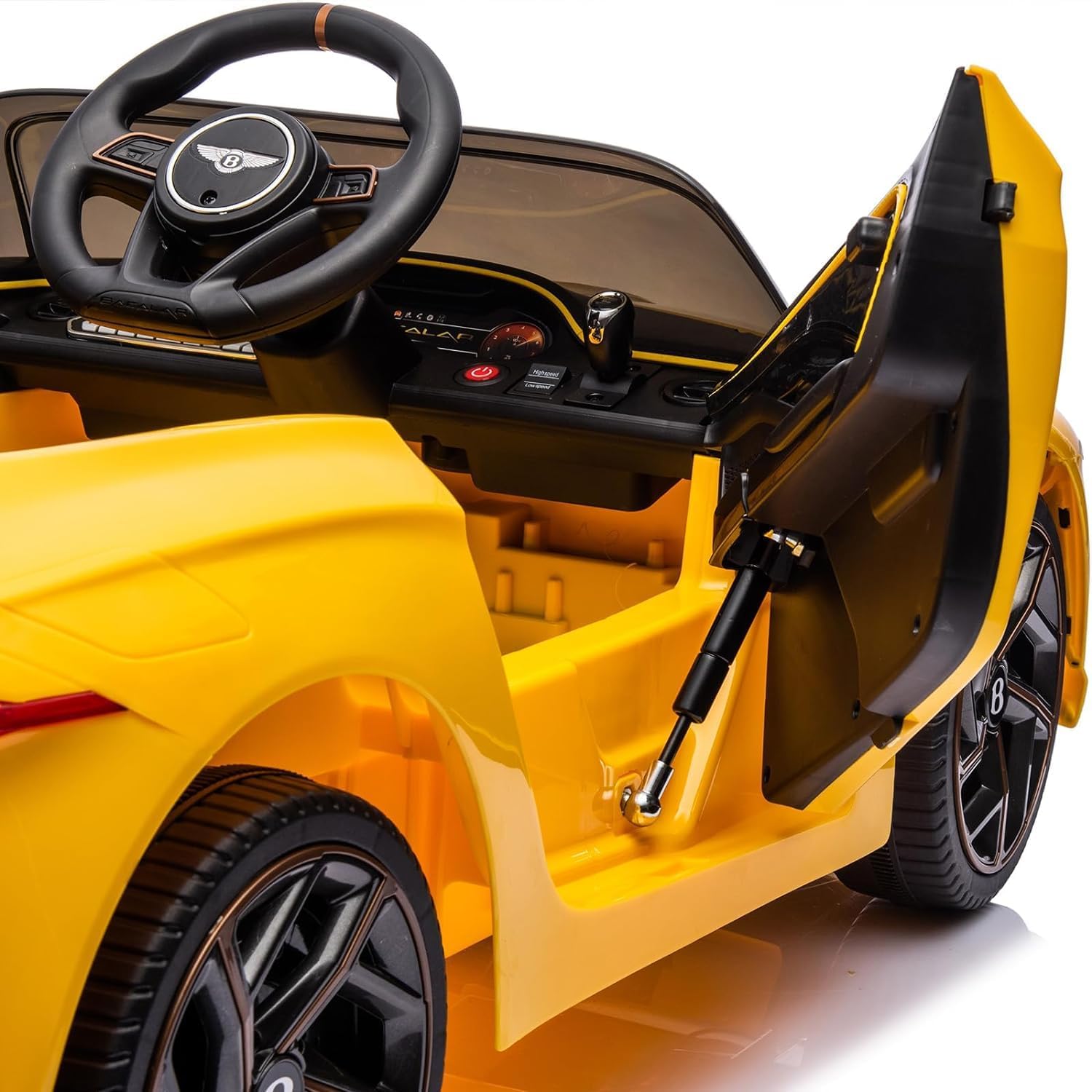 OFFICIAL LICENSE LAMBORGHINI This kids car with 12V battery features double hydraulic doors and four powerful motors that provide children with a realistic driving experience. The wide seat with safety belt also ensures a high level of comfort. In addition, the car offers a swivel function for even more driving fun