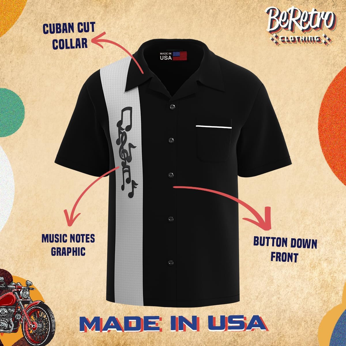 Elevate your retro style with our Men's Vintage Jazz Shirt in classic black, adorned with white accents and music notes. This timeless piece exudes the charm of the bygone era, perfect for jazz aficionados and fashion enthusiasts alike. Crafted with meticulous attention to detail, the shirt boasts a crisp white collar and cuffs, complemented by an eye-catching music note pattern that adds a touch of sophistication. Whether you're swinging on the dance floor or strolling the streets or playing on stage, this shirt effortlessly blends vintage vibes with modern comfort. Rediscover the allure of the 1950s and make a statement with our jazz-inspired masterpiece. Music-themed clothing Made right here in the USA.