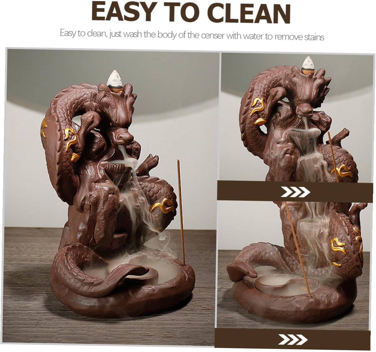 Package List 1 x Backflow Incense Burner Features -Material: Purple Sands -Product Info:incense burner -Color: Brown -Size: About 18.50X14.00X12.00cm/7.27X5.50X4.72in - This incense holder is suitable for all common incense, such US back flow incense cones, incense sticks Incense Holder Home Adornment. - Suitable for many scenes like study, bedroom, sauna room, yoga , etc Dragon Censer Decor. - With fine workmanship, can be a classical furnishing, with meditation and aid-sleeping effect Creative Dragon Incense Burner. - It is very suitable for aromatherapy and fresh fragrance, you can use with confidence Purple Sand Craft Decor. - Can provide a relaxed atmosphere, improving and relieving stress and fatigue Dragon Statue Decor.Goods InformationIncense Holder Home Adornment A necessary art work and to someone who loves eastern accessories.Dragon Statue Decor Great for living room, bedroom, study, office, meditation room, yoga room, hotel, library, etc.Incense Stick Holder Made of purple sand , designed with creative and shapes