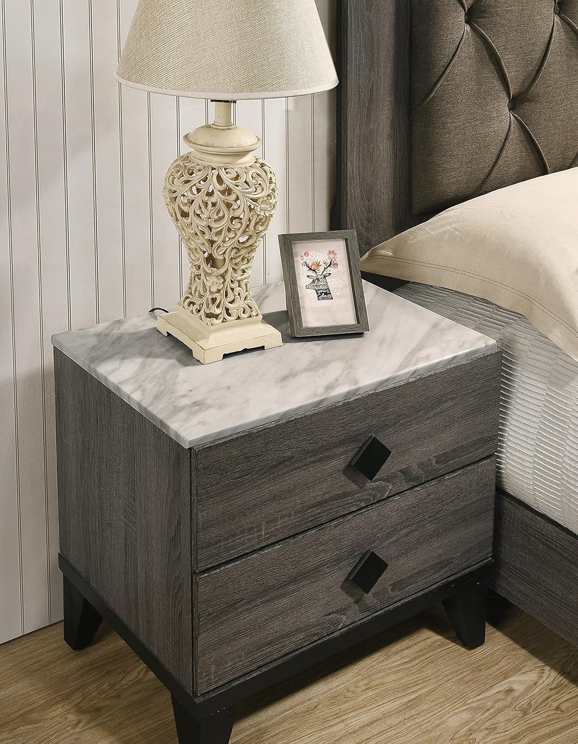 Make good interior design seem effortless with the timeless appeal of this transitional look nightstand. It follows a simple design concept, but yet elegant and can be fit to any theme of your room. With beautiful walnut color and faux marble top design, this nightstand will look clean and stylish wherever it goes. Featuring two drawers made from strong and sturdy wooden materials, the nightstand offers some extra storage for small items to keep your bedroom always look organized. Features: 2 drawers Assembly required Color: Walnut Material: MDF Solid Wood (rubberwood)