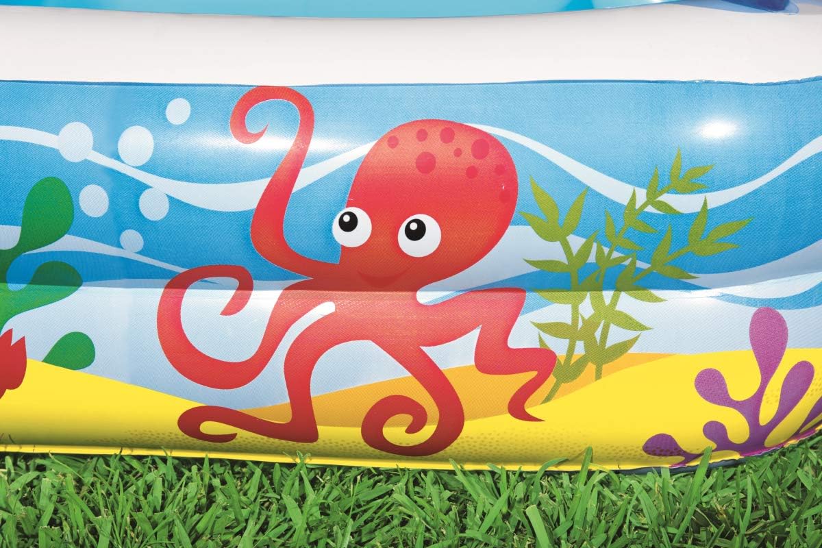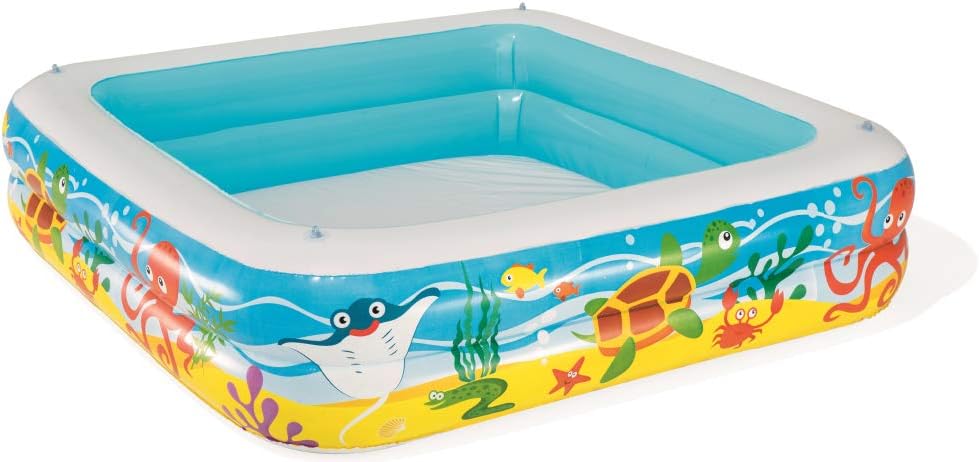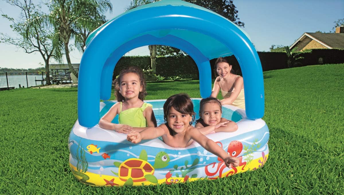 1.47 x 1.47 x 1.22 m (58 x 58 x 48 inches). Safety valves. Sturdy pre-tested vinyl. Removable sun shade with easy to use fasteners. Drain plug. Repair patch. Full colour box. Designed water capacity: 265 L (70gal). Content: One pool, one sun shade, repair patch.